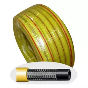Трехслойный садовый шланг для общего применения. Внешний слой непрозрачного желтого цвета с оранжевой полосой, плетеное текстильное армирование, внутренний черный слой предотвращает образование водорослей.
