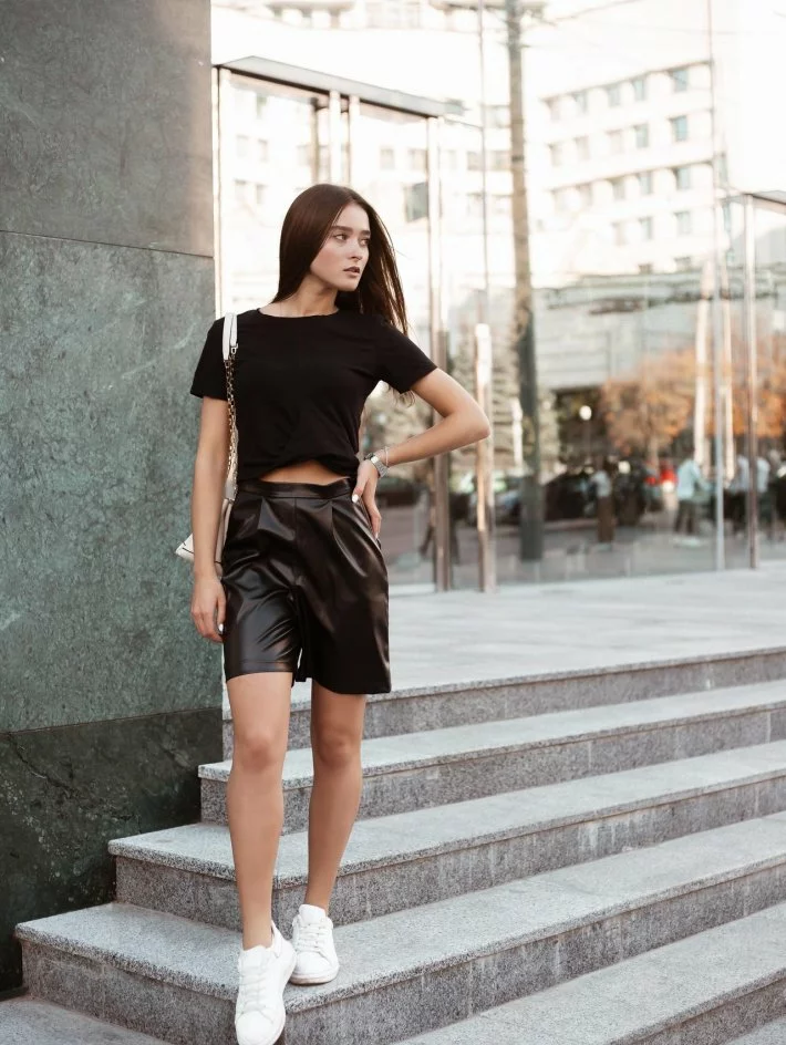 Шорти із чорної еко-шкіри на високій талії з функціональними