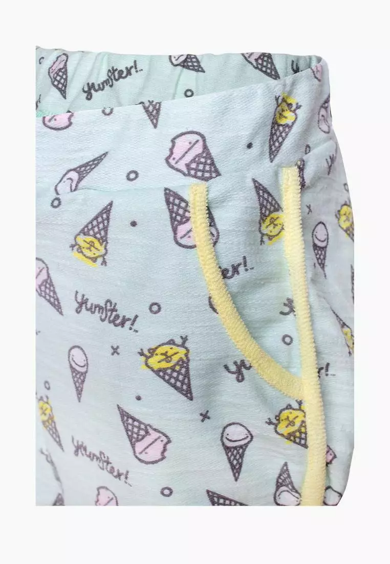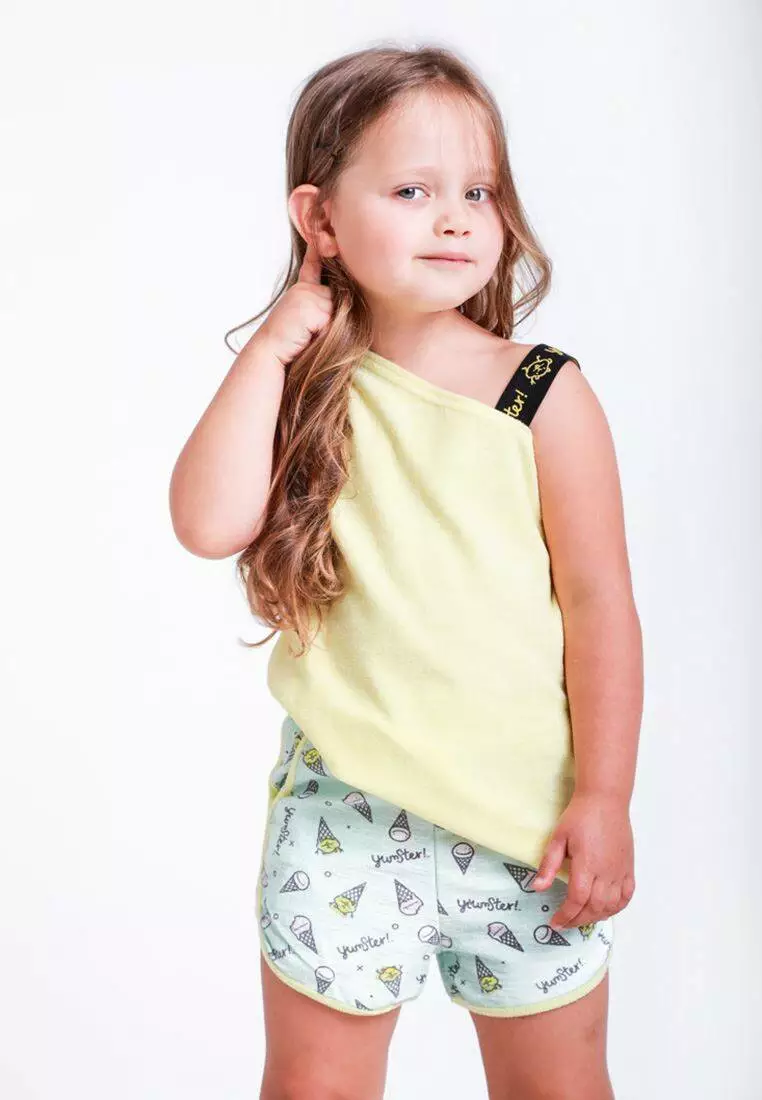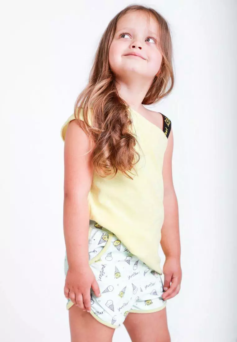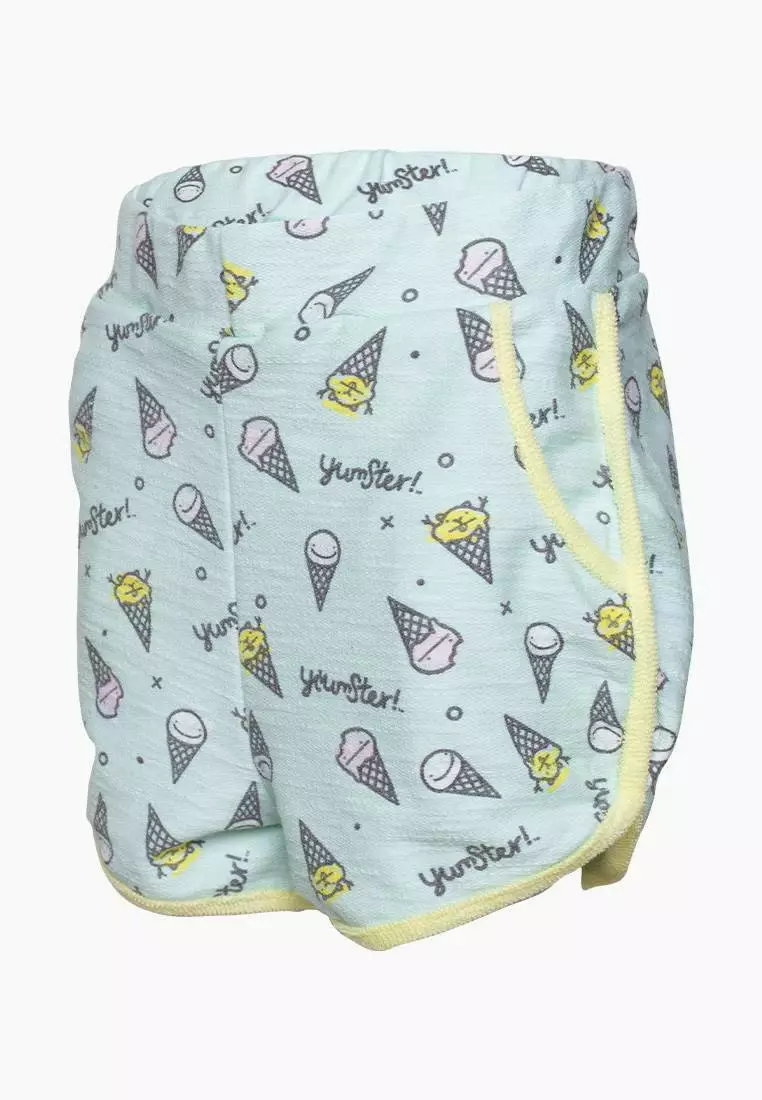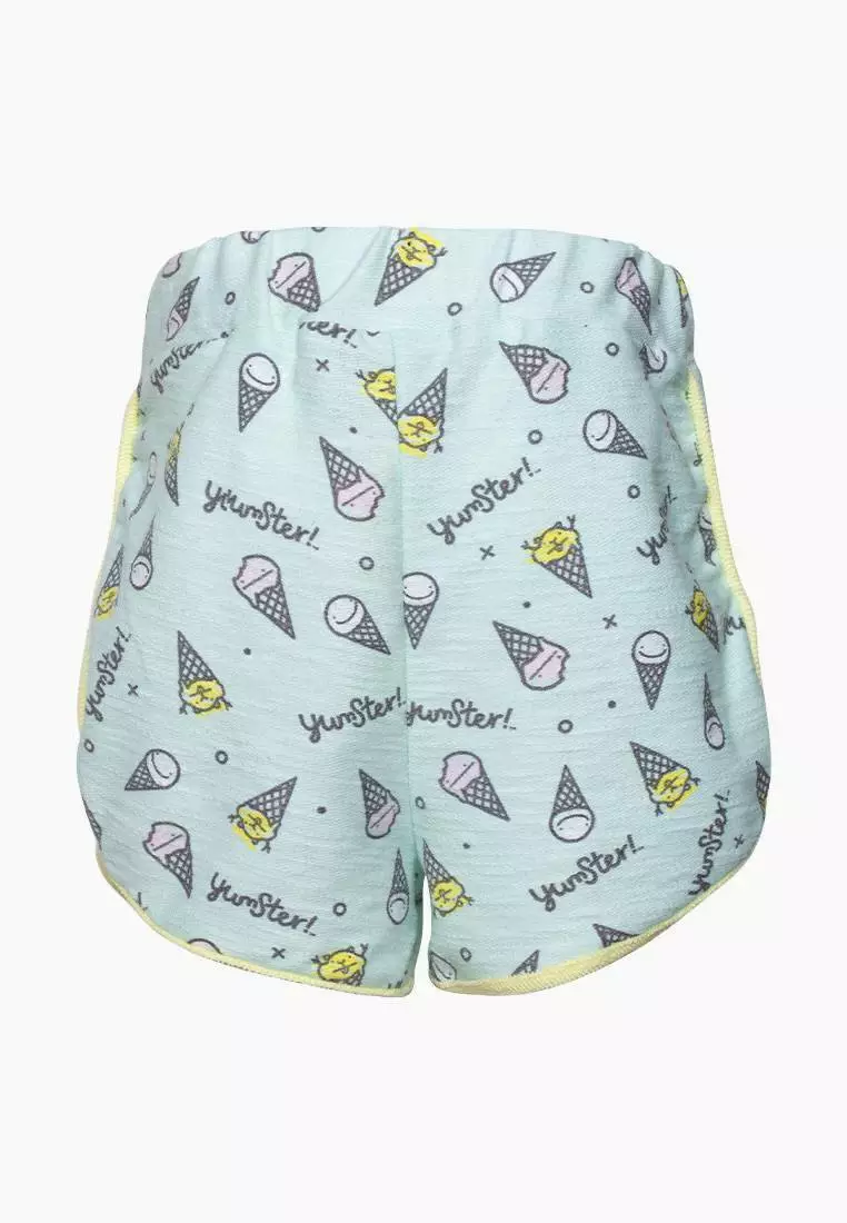 Деталі: Основний колір шорт - бірюзовий. Дизайн - патерн "морозиво". Якісна резинка. Жовті лампаси. Дві бічні кишені. Середня висота посадки.