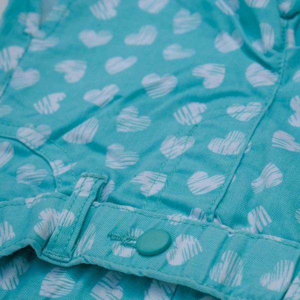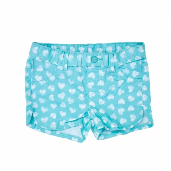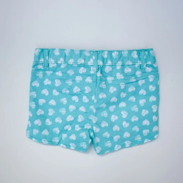 Шорты с принтом "сердце" , пояс - резинка с декоративной кнопкой и карманами - обманками, имеют небольшие боковые разрезы.