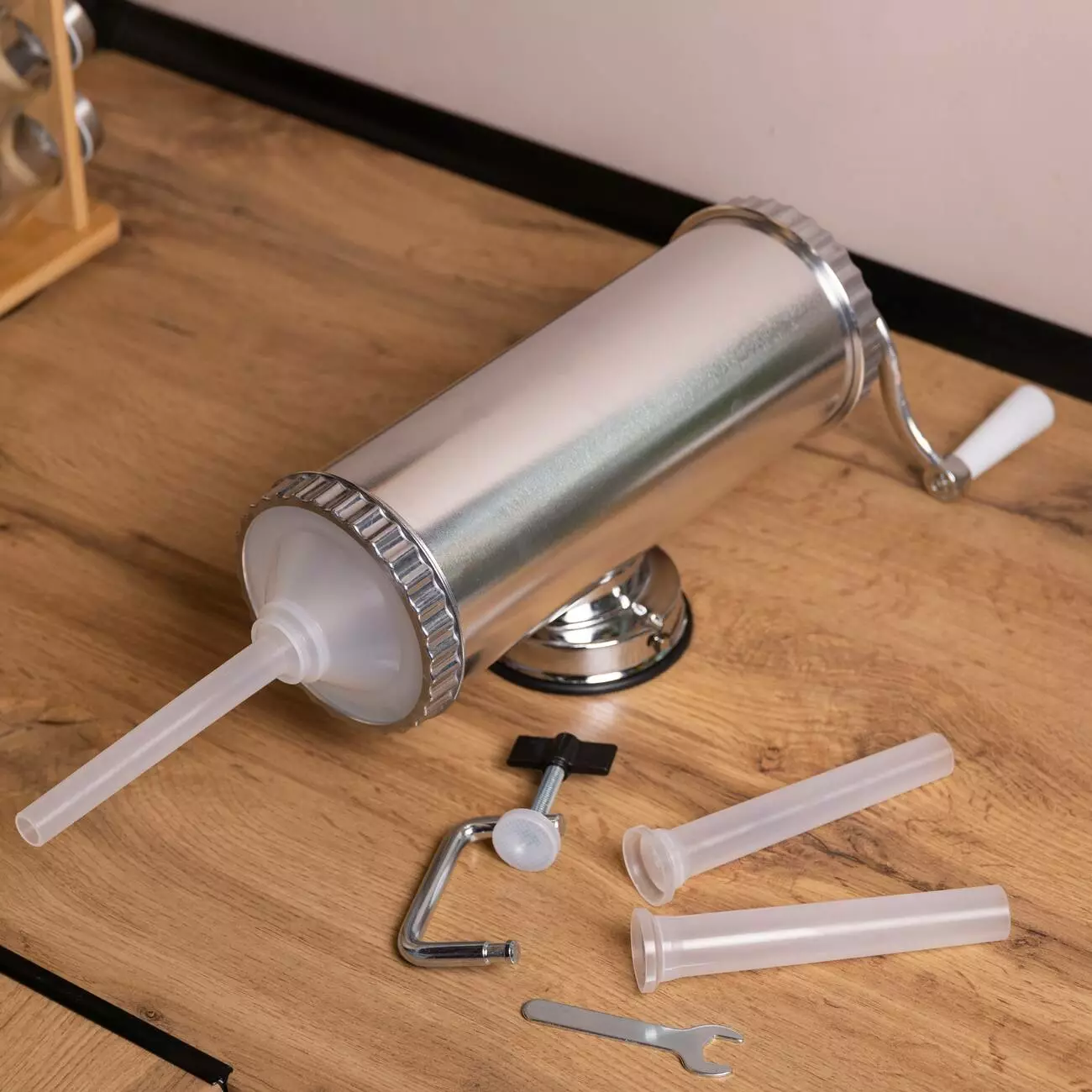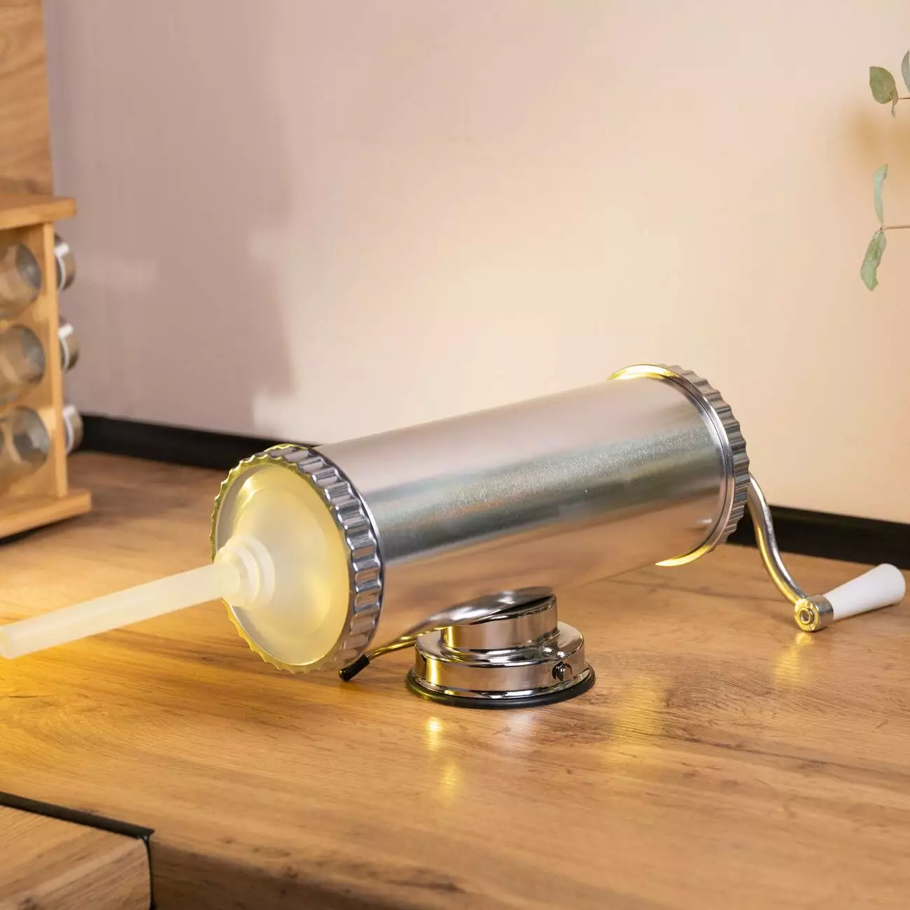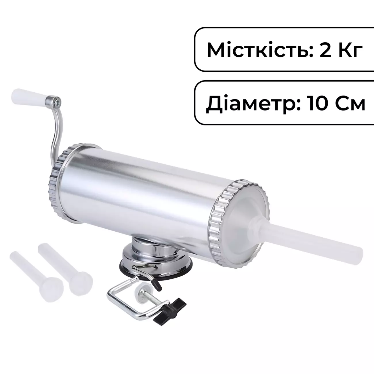 Шприц ковбасний на 2 кг - ідеальний інструмент та помічник у процесі наповнення оболонок ковбасним фаршем. Шприц має простий принцип роботи, ручний привід обладнано зручною ручкою. Вакуумний принцип кріплення дозволяє надійно зафіксувати шприц на робочій поверхні, є додаткова струбцина.