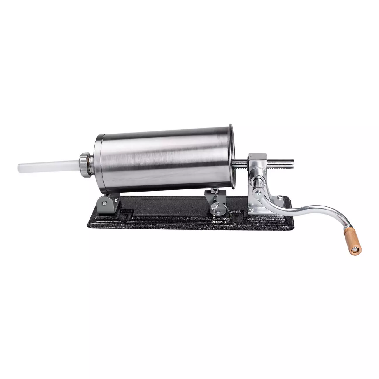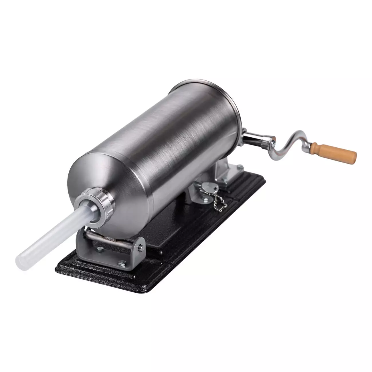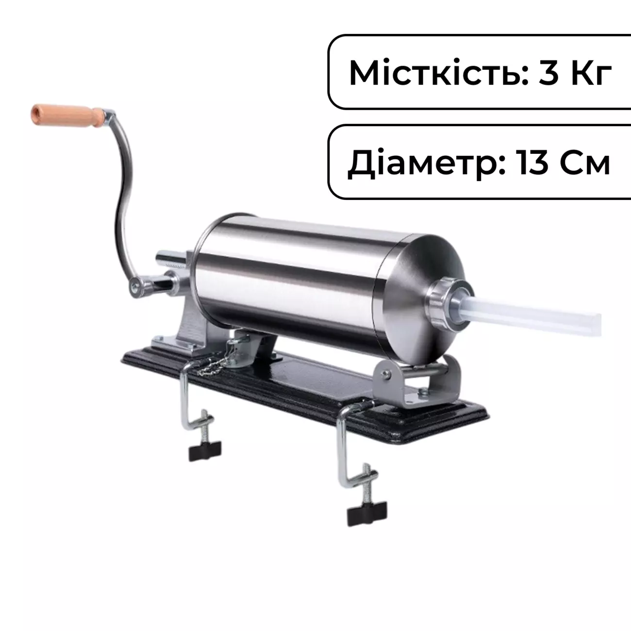 Шприц ковбасний на 3 кг - ідеальний інструмент та помічник у виготовленні великих обсягів ковбасних виробів. Шприц має простий принцип роботи, ручний привід обладнано зручною ручкою. Для фіксації шприца на робочій поверхні в комплекті є 2 струбцини.