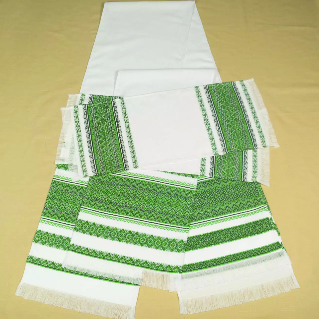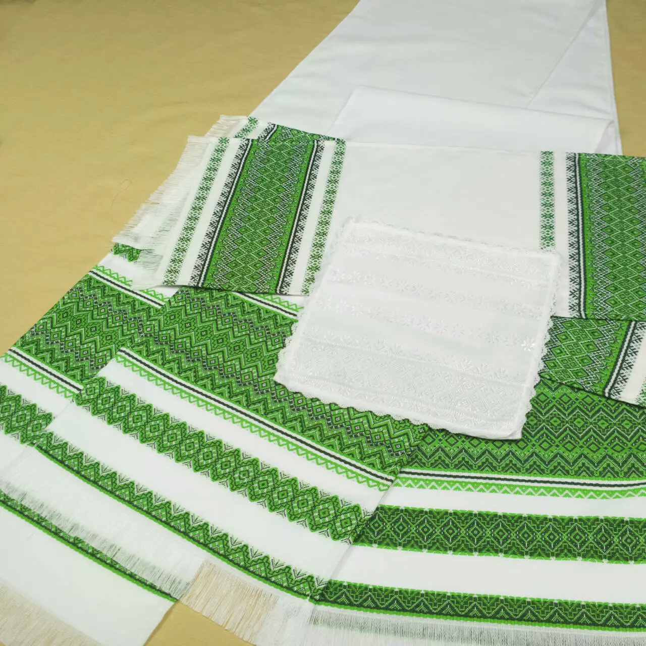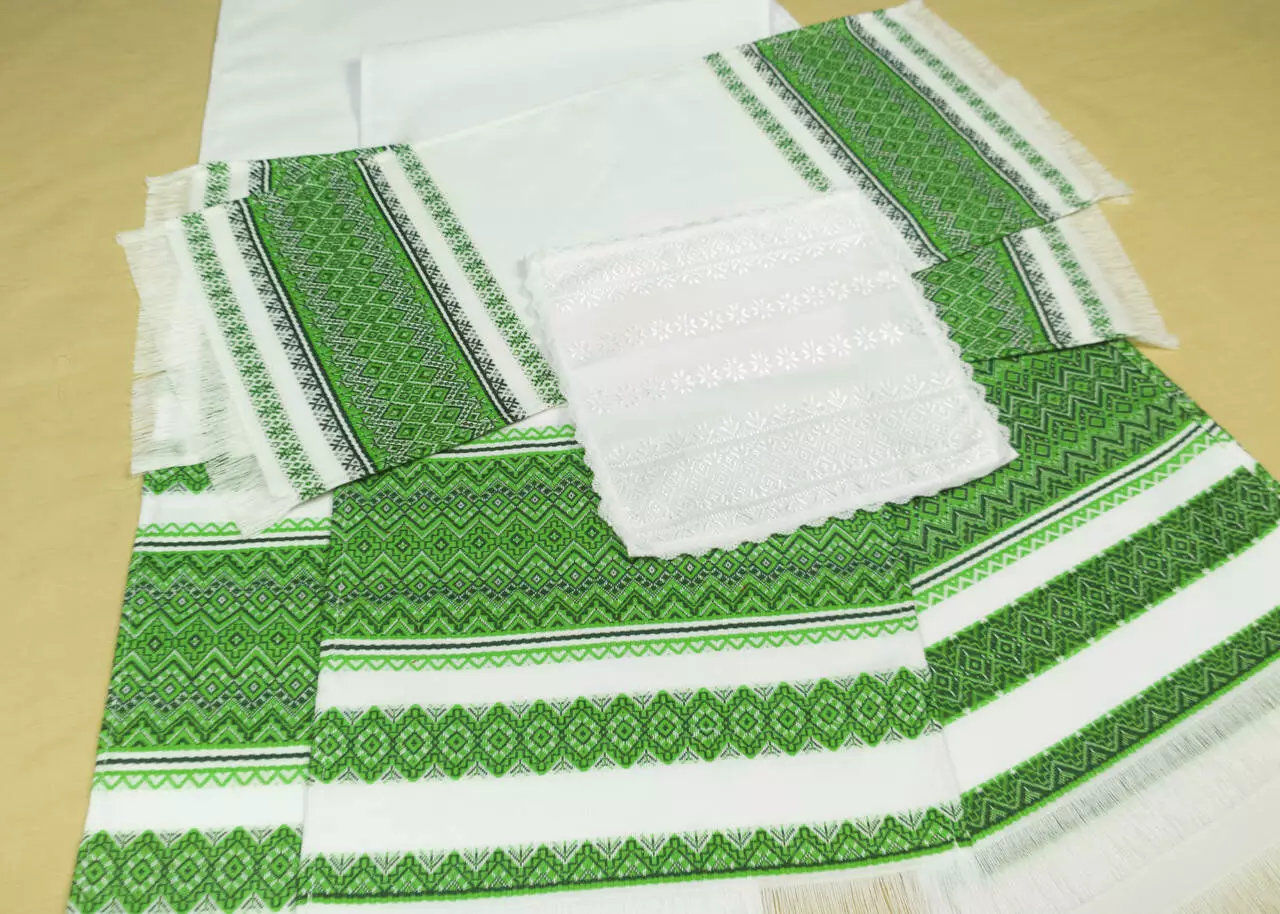 Рушники і серветка с тканим зеленим орнаментом. Орнамент зроблений з акрилових  ниток, що надає їм святкового вигляду. Тканий орнамент зблизька виглядає як вишивка гладдю, а по ціні набагато доступніше.