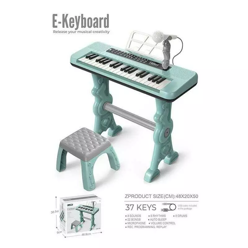 Синтезатор 328-69 (10) мікрофон, стілець, 37 клавіш, від мережі або батарейок, звук, мелодії, регулювання гучності, функція запису, в коробці
