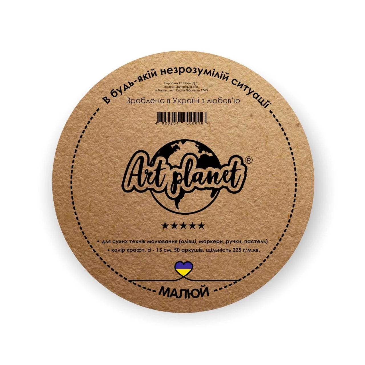 Тогда обратите внимание на фирменный крафтовый круглый альбом, диаметром 15 см с твердой подложкой от Art Planet на 50 листов.