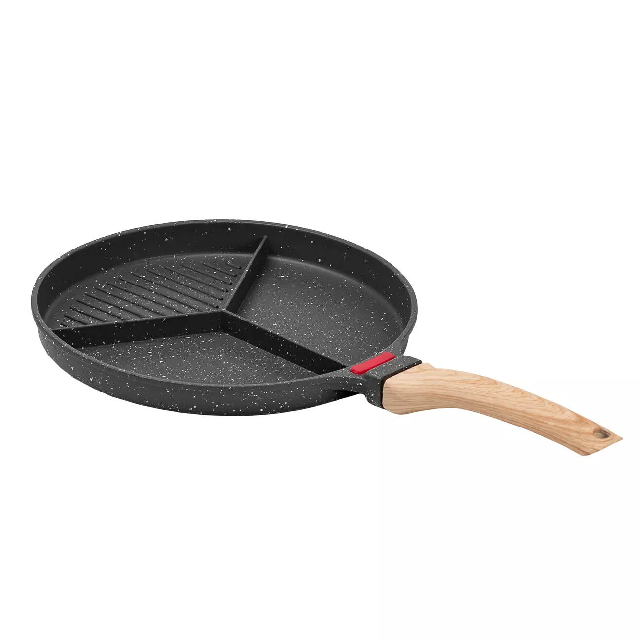 Кожна з трьох секцій має об'єм 200 мл, що дозволяє готувати різні страви окремо, зберігаючи їх смакові якості. Ручка виготовлена з бакеліту і прикручується на шуруп, що робить її міцною та зручною у використанні. Для збереження антипригарного покриття рекомендується готувати на малому або середньому вогні та використовувати дерев'яні або силіконові лопатки, уникаючи металевих інструментів, які можуть пошкодити поверхню.