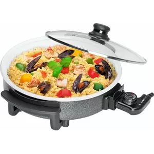 Прилад для приготування їжі, випічки, пари, розморожування разом з функцією підігріву Швидке опалення Знімний шнур живлення з безступінчатим термостатом Сковорода керамічна з покриттям (стійка до подряпин та легко миється) Діаметр: 42 см, глибина: 9 см Кришка-термостійке скло з ручкою 220-240 В, 50/60 Гц, 1500 Вт