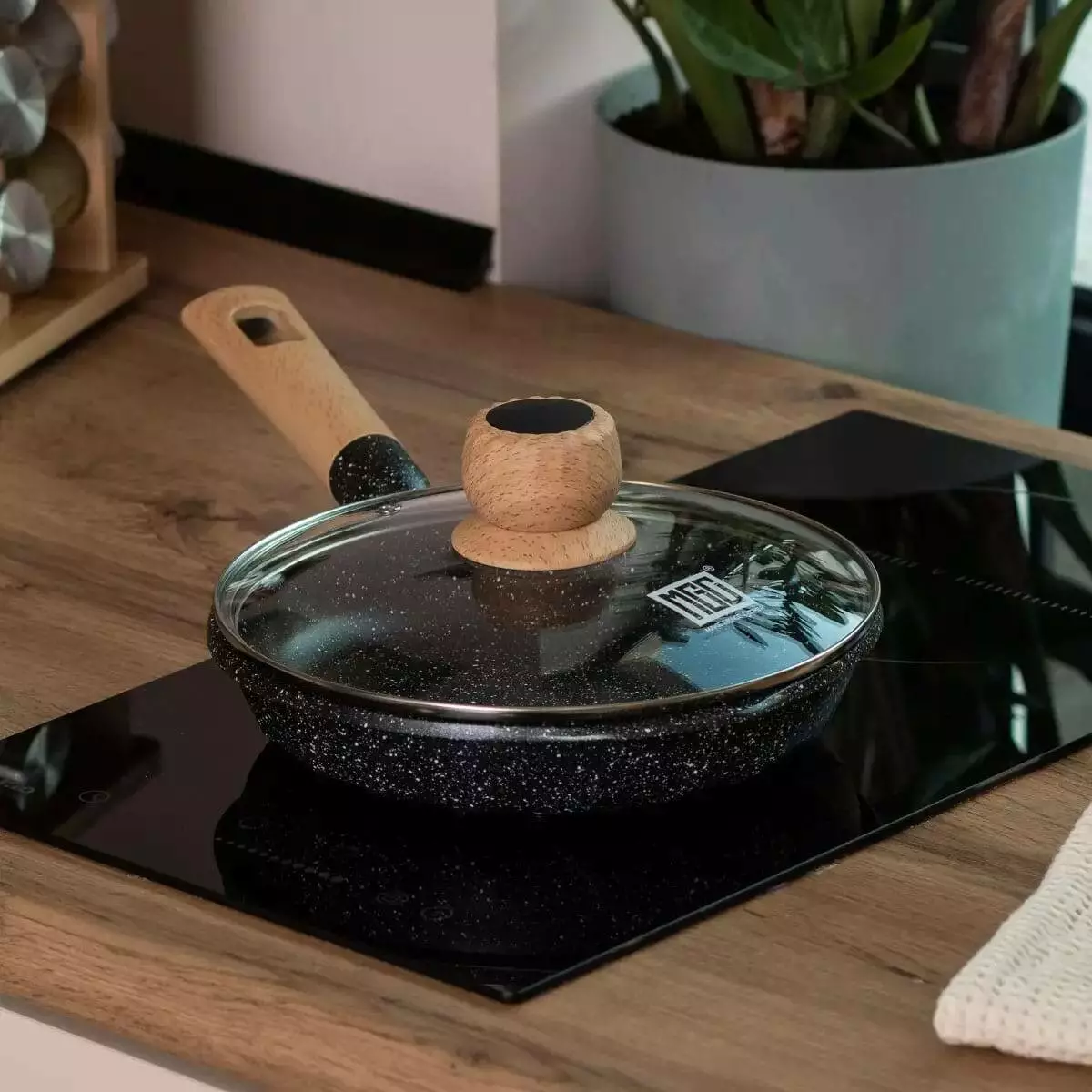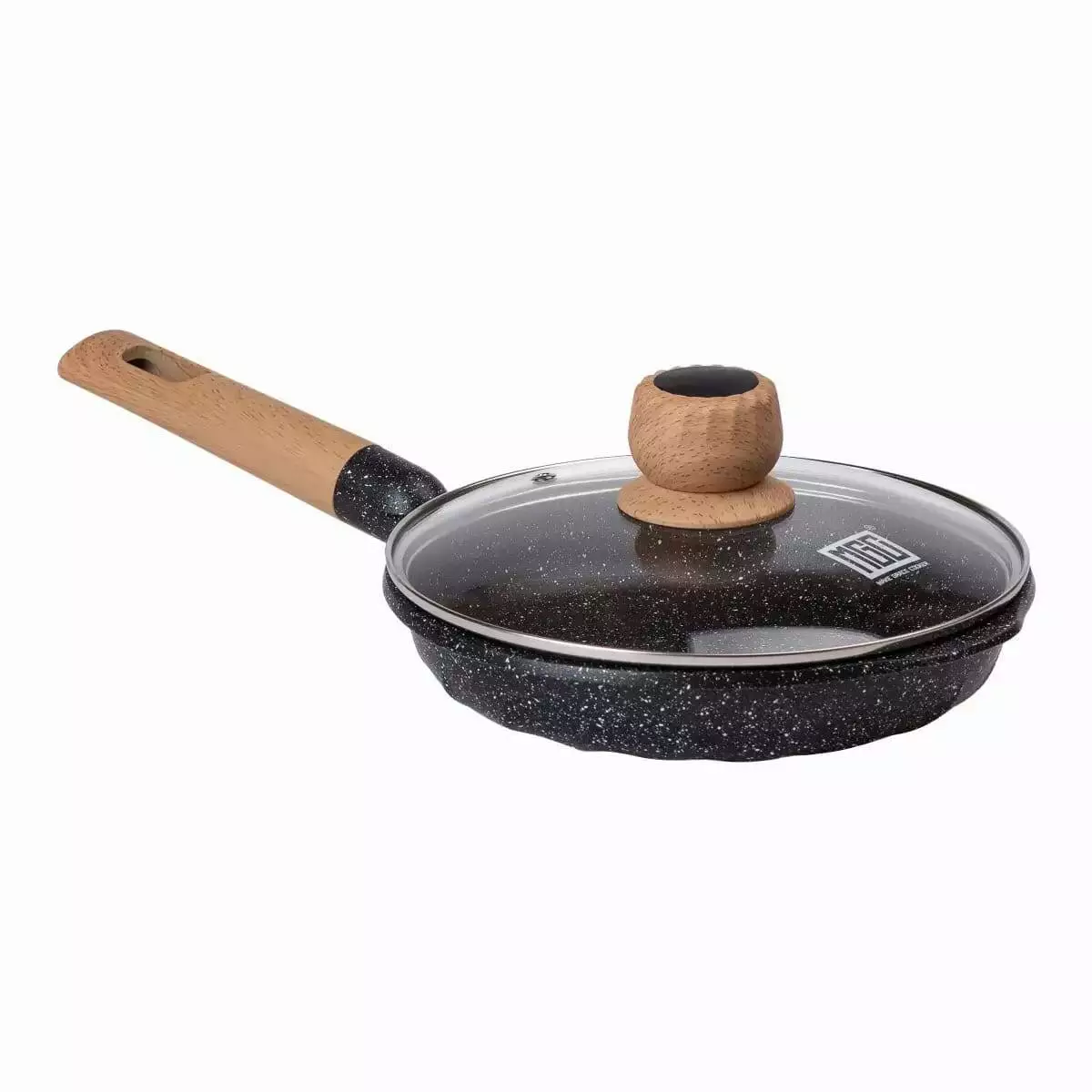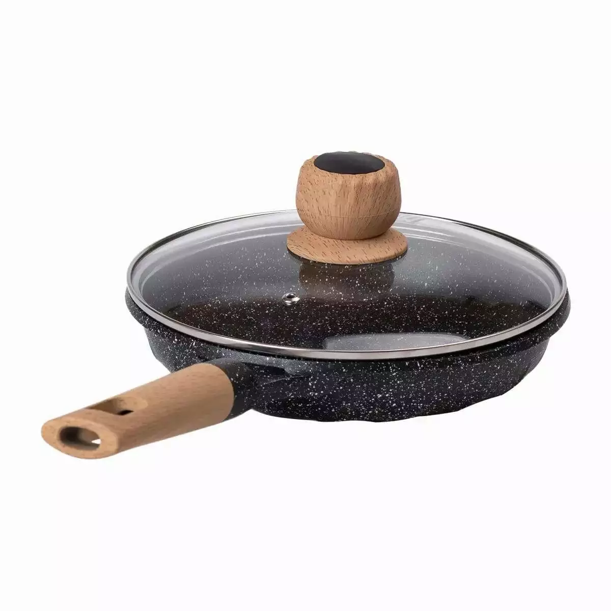 Сковорода має зручну ручку з бакеліту, який стійкий до високих температур і не нагрівається, що робить користування безпечним і комфортним. Скляна кришка із жароміцного скла дозволяє слідкувати за процесом приготування без необхідності її відкривати, зберігаючи тепло та аромат страви всередині.