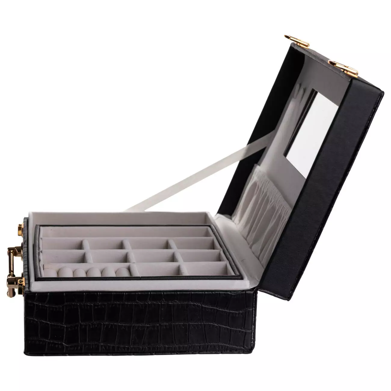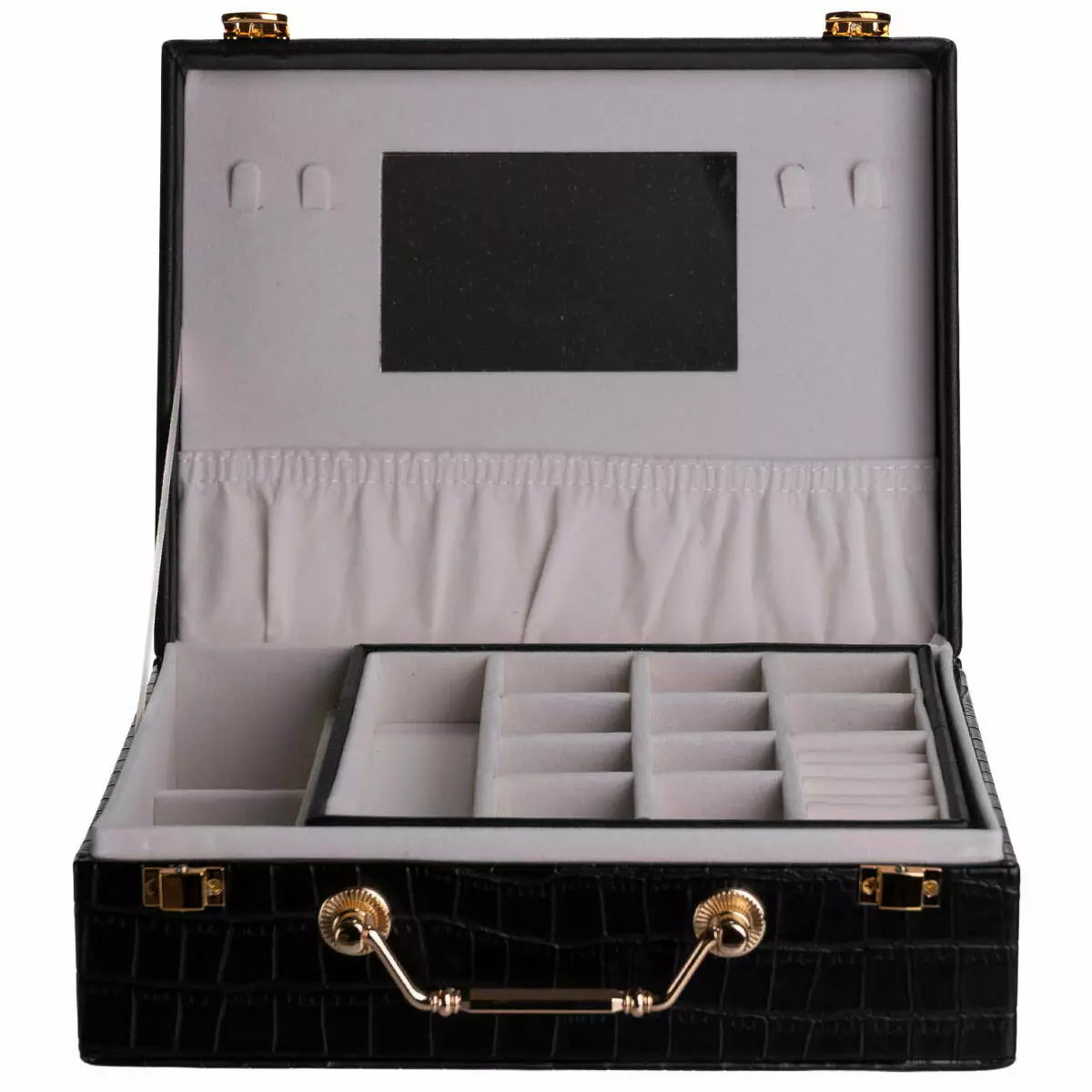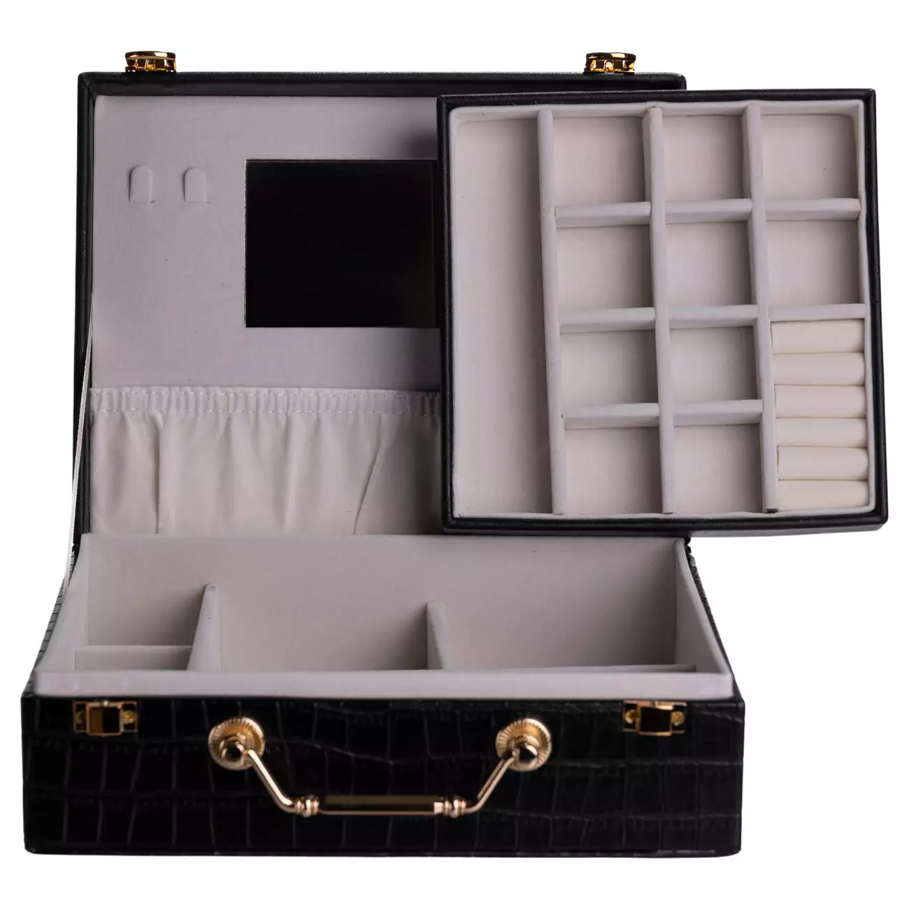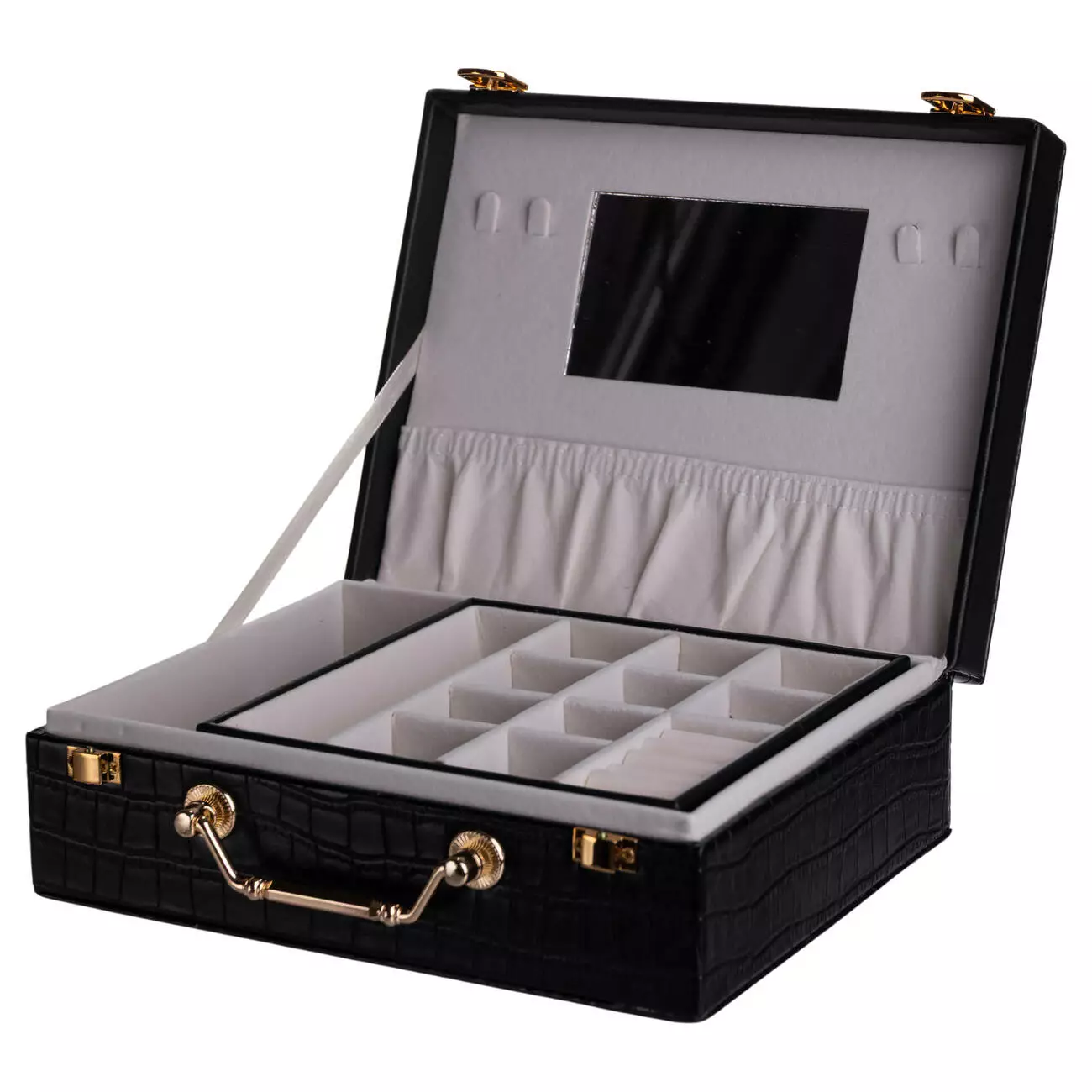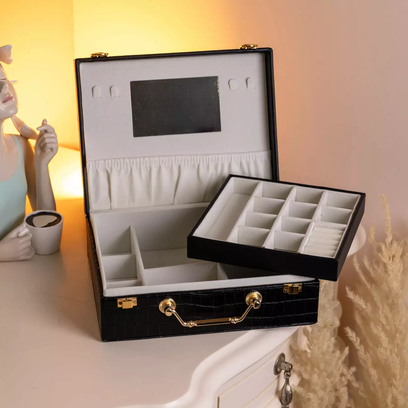 Внутрішній простір організований у два яруси з 19 комірками для розміщення прикрас різного типу. Дзеркало на внутрішній стороні кришки додає практичності під час використання. Велюрове покриття всередині сприяє дбайливому зберіганню та допомагає зменшити ризик подряпин і пошкоджень.