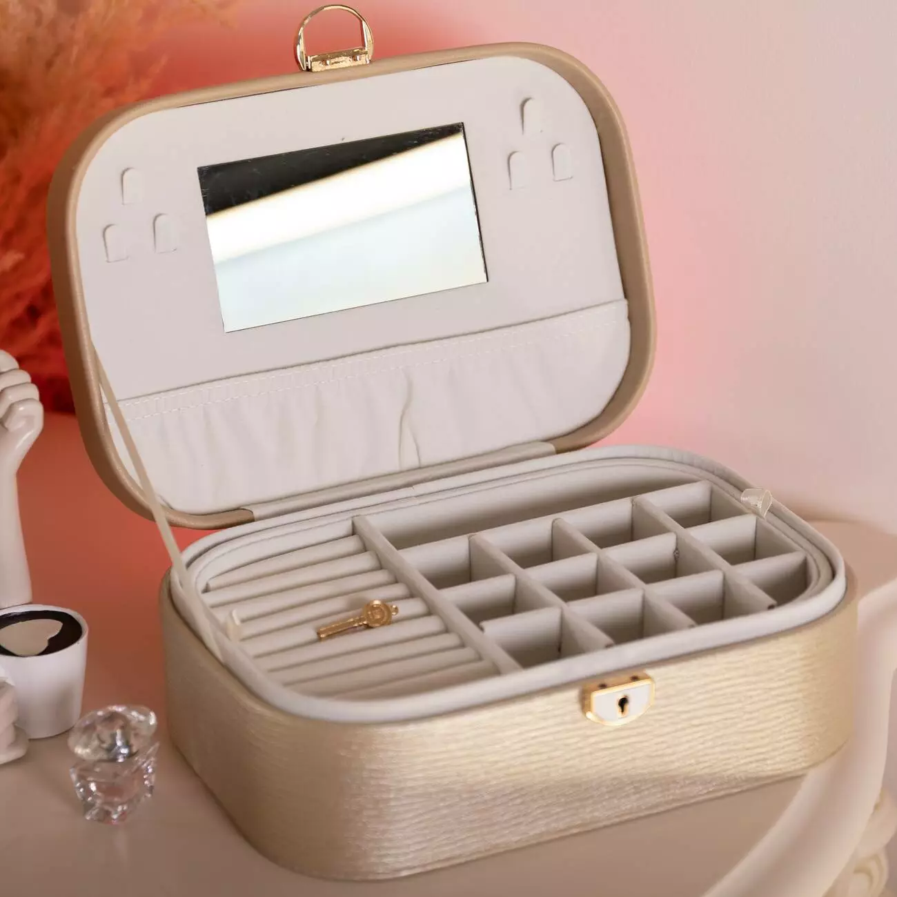 Органайзер доповнений дзеркалом у кришці, що робить його використання ще зручнішим. Скринька щільно закривається, замочок має обмежувальне кільце і додатково замикається на ключ.
