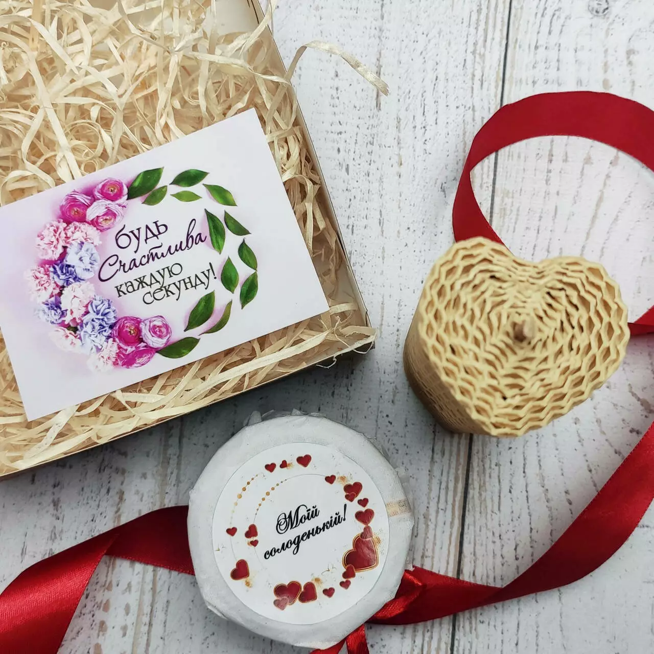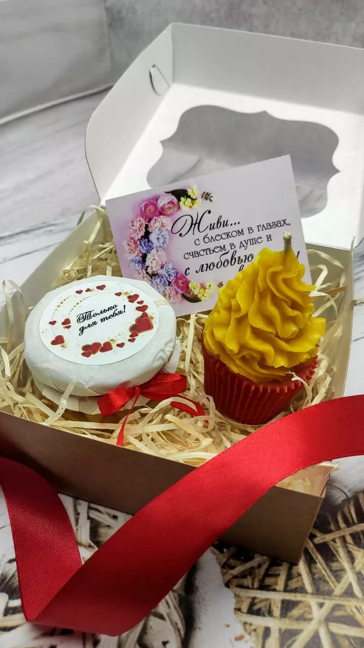 Набір доповнений тематичною вітальною листівкою, упакований у подарункову коробочку зі стрічкою та біркою.
