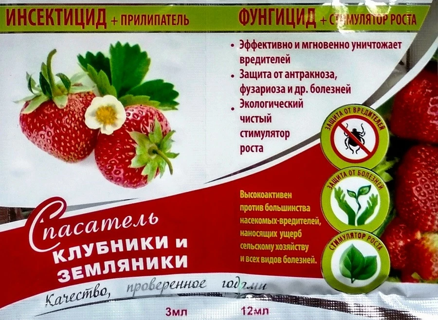 Данный препарат применяется для обработки клубники с целью истребления и защиты от различных насекомых-вредителей и грибковых заболеваний. В состав препарата входит экологически чистый стимулятор роста, фунгицид от болезней, инсектицид от насекомых и прилипатель увеличивающий срок действия средства. Спасатель клубники эффективно действует при повышенных температурах и не наносит вреда самой культуре и окружающей среде.