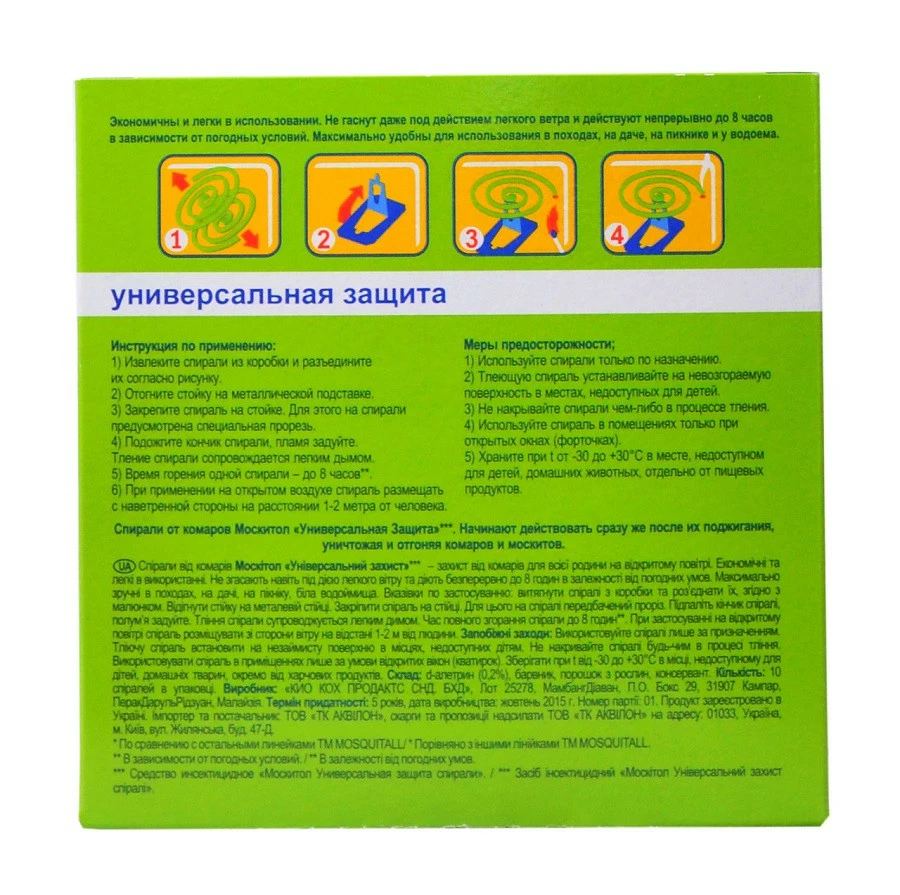 Время эффективного действия одной спирали - 7:00. Защищают от комаров, мошек и москитов. В одной упаковке - 10 спиралей. Спирали от комаров + 2 подставки. Защита до 80 часов.