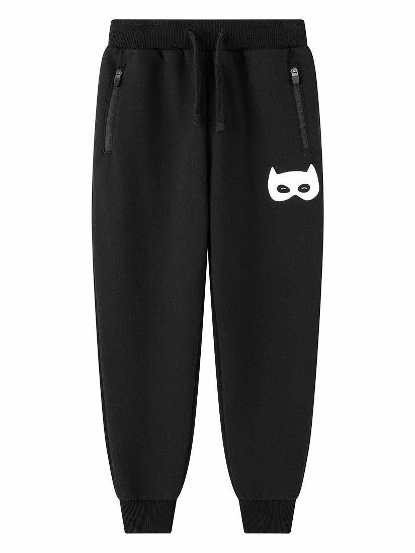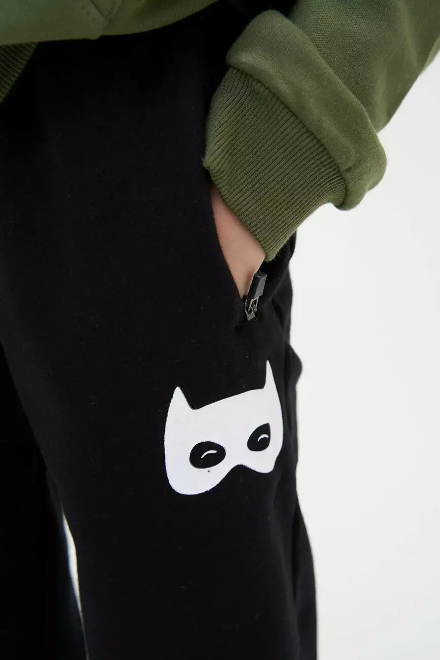 Зустрічайте нову колекцію - колаборація брендів YUMSTER і NEWNESS! Зручні, якісні та супер стильні спортивні штани для хлопчиків. Деталі моделі: штани чорного кольору. З боків кишені на блискавці. Попереду є білий принт із зображенням маски. Пояс на резинці. Є шнурок для затягування. Низ брючини на эластичній резинці. Штани з начосом. Розмірний ряд: на зріст від 98 см до 134 см