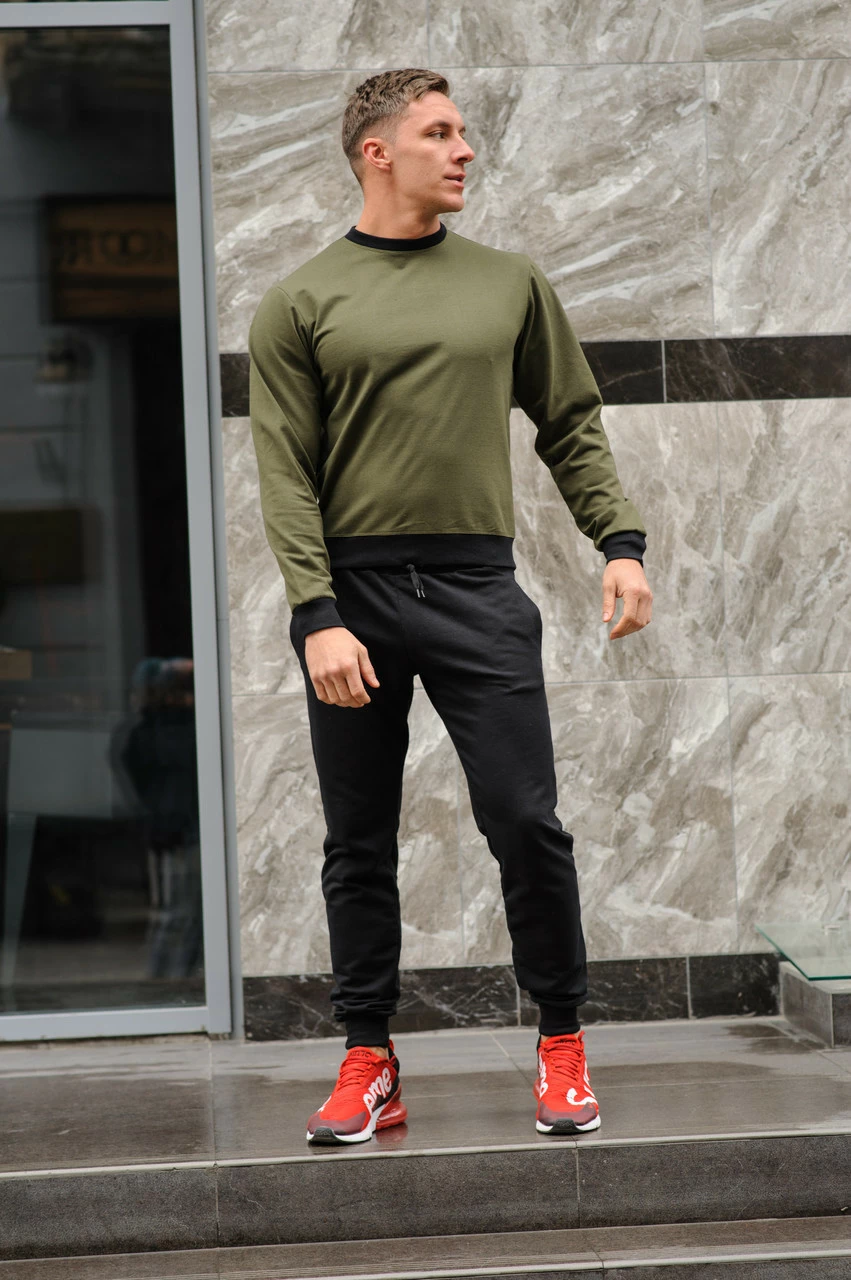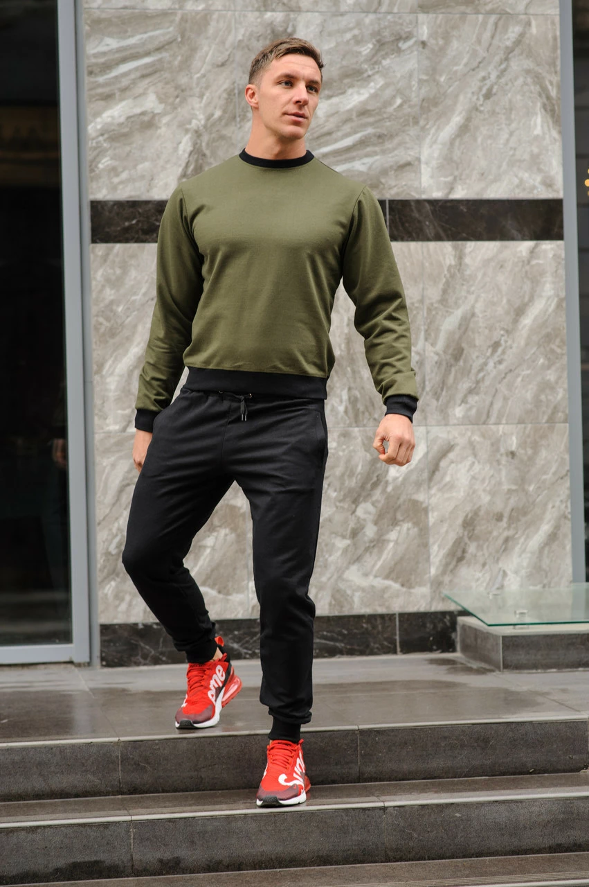 Спортивный костюм мужской весна-лето-осень (свитшот хаки + черные штаны)