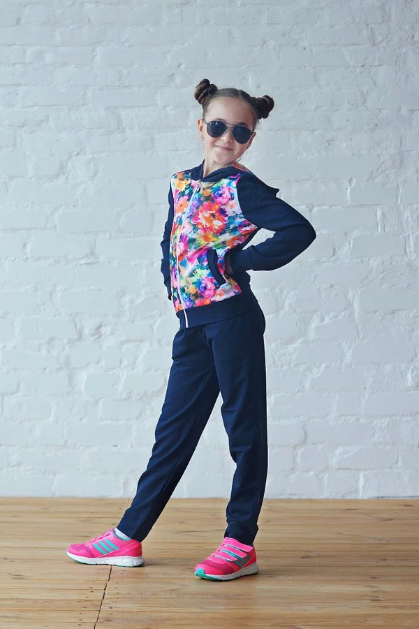 Спортивный подростковый костюм для девочек с капюшоном.Тёмно синий цвет костюма с вставками на груди и в капюшоне из дайвинга с цветным принтом.Этот костюм прекрасно подойдёт девочкам подросткам возрастом с 7 до 11 лет. Данную модель можно использовать как в повседневной жизни так и для активного занятия спортом на природе или в закрытом помещении.