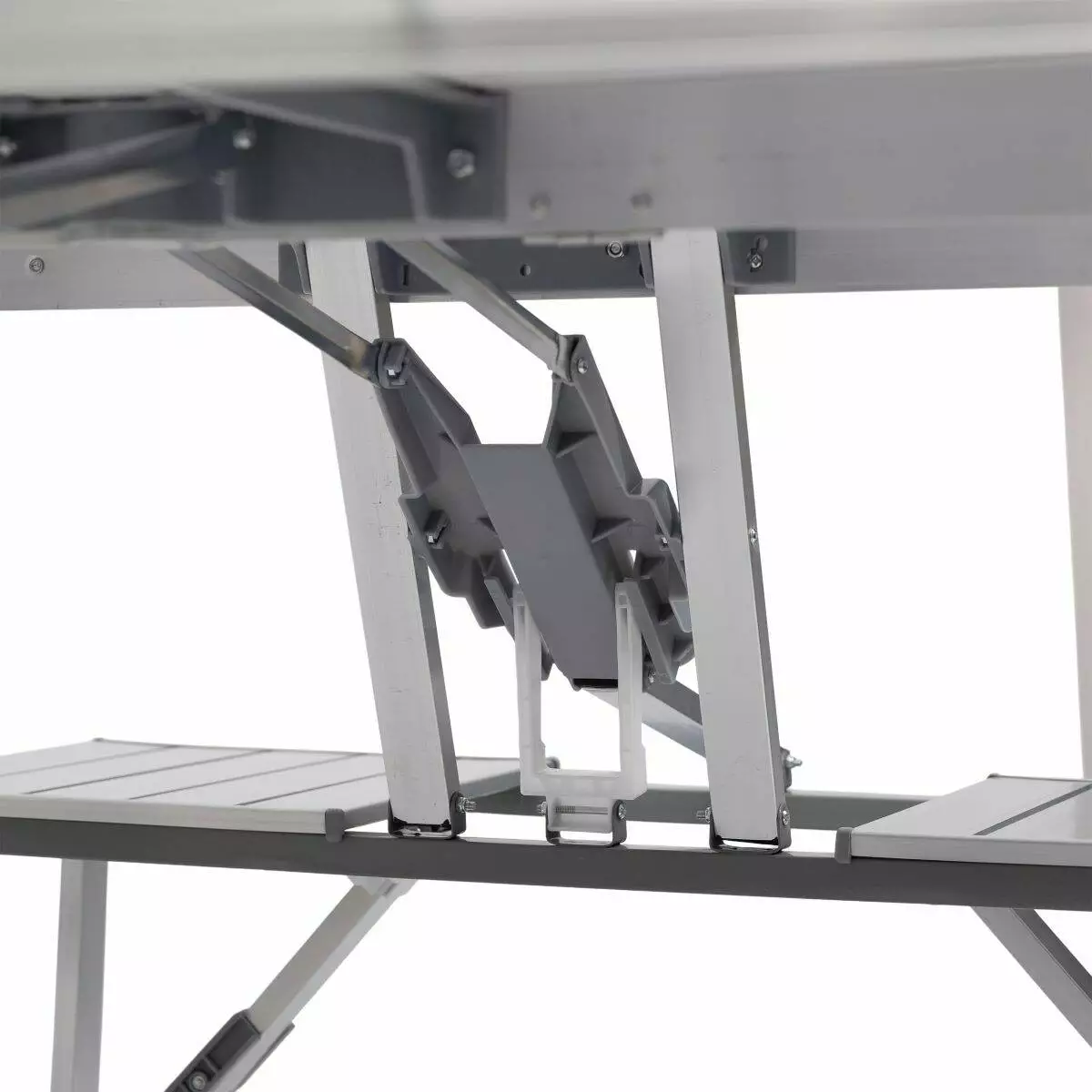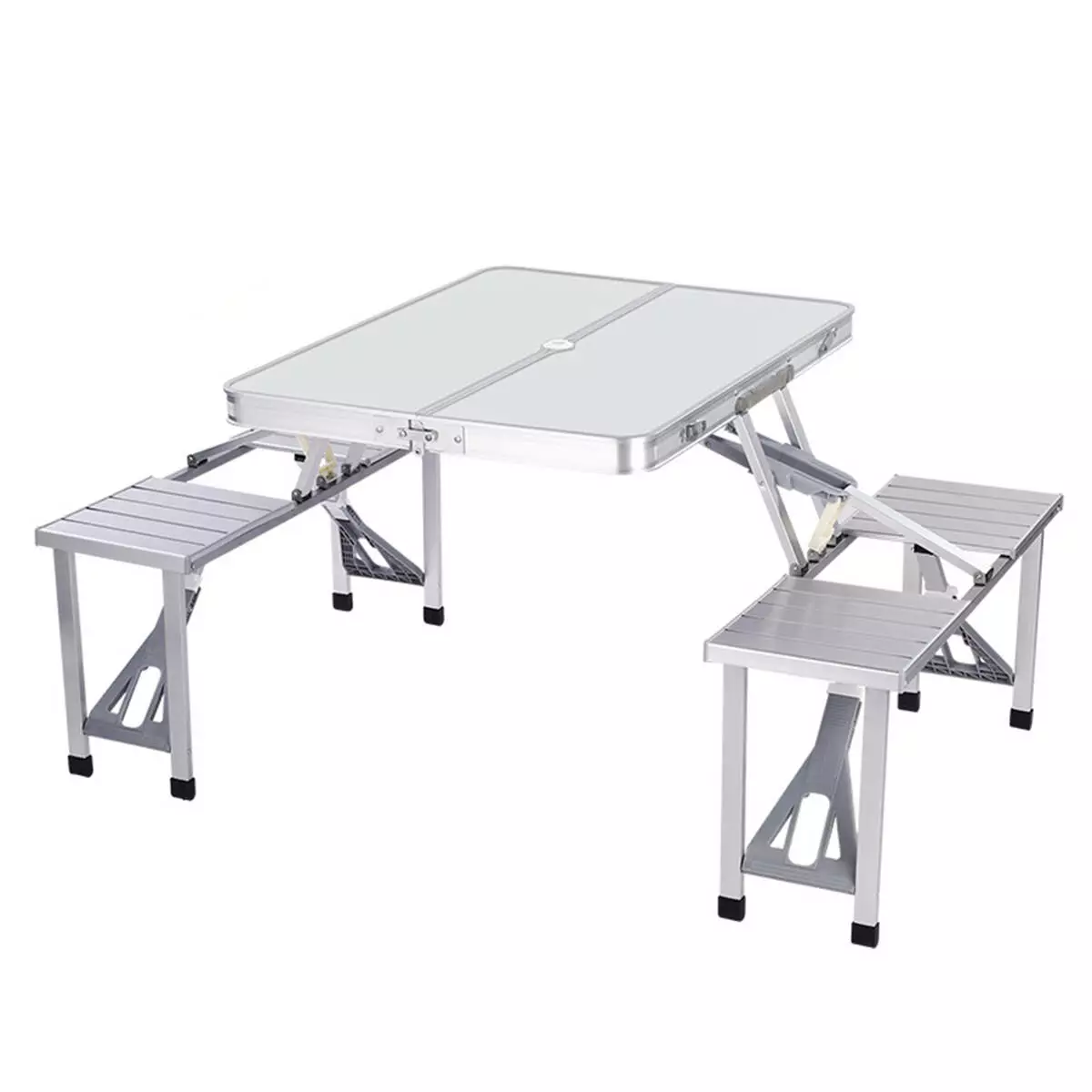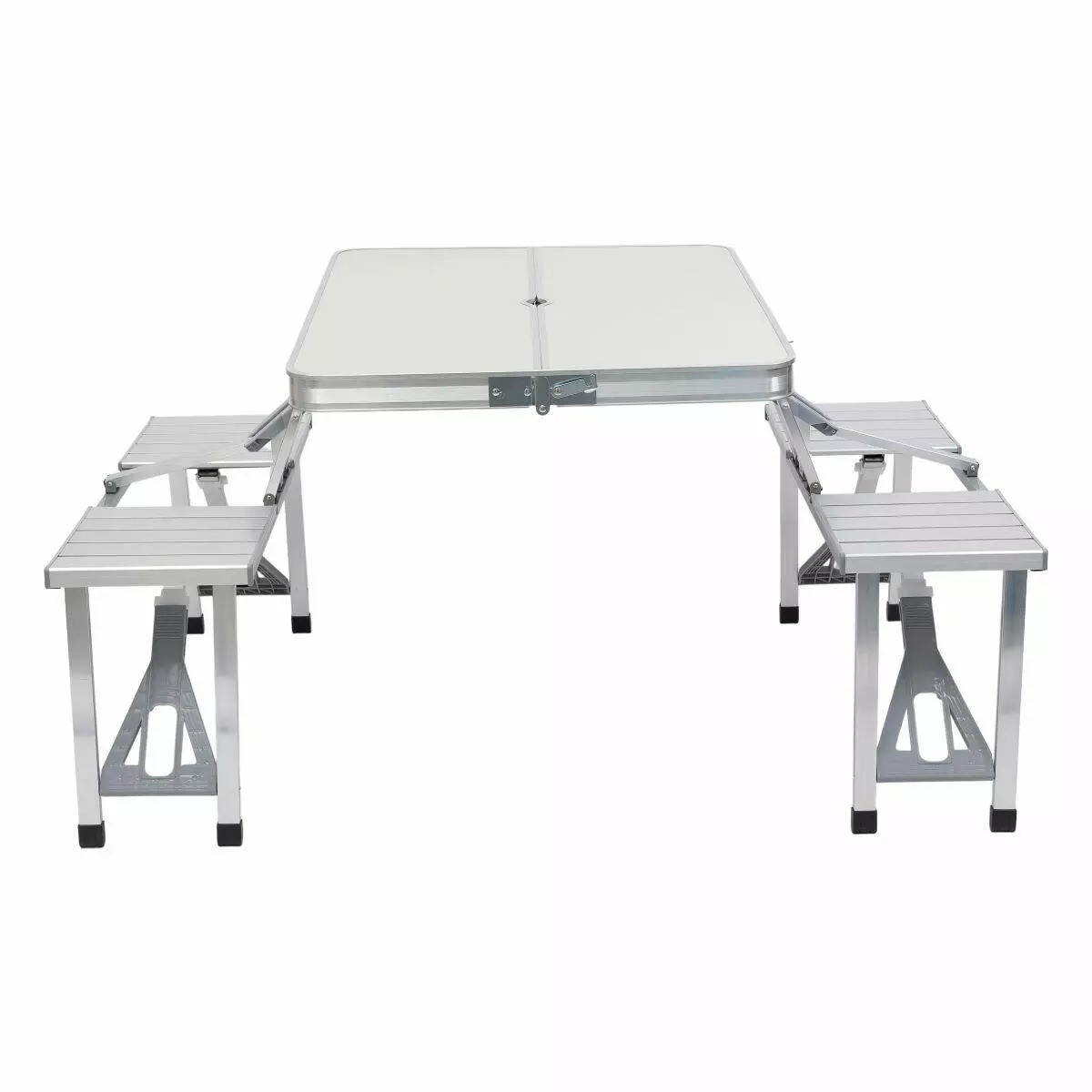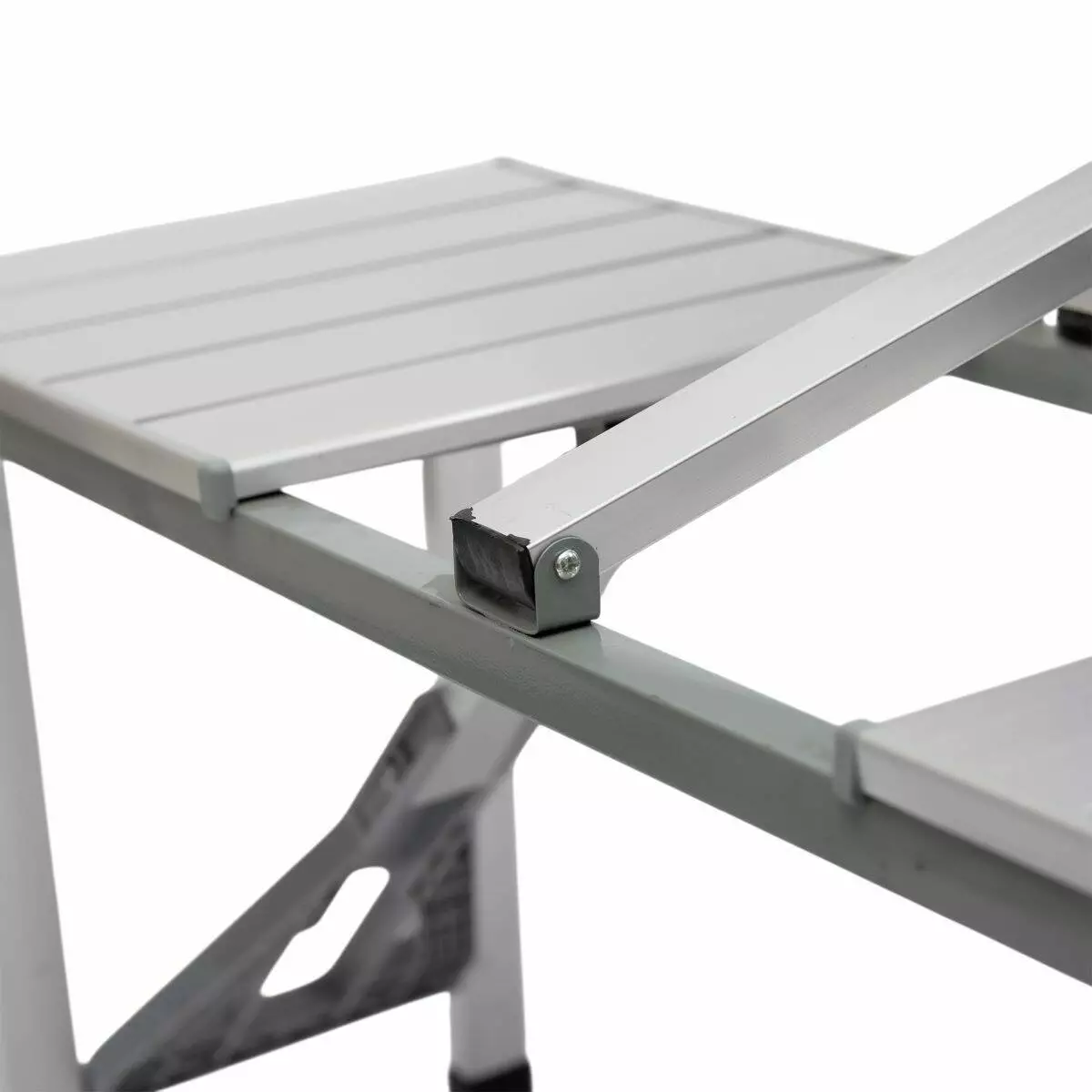 Алюмінієвий стіл-трансформер призначений для комфортного використання під час кемпінгу, поїздок, подорожей або відпочинку на природі. Завдяки складаній конструкції він легко трансформується у валізу з ручкою розміром 86×34×10 см, що дозволяє зручно транспортувати його в багажнику автомобіля. Модель обладнана вбудованими сидіннями, за якими одночасно можуть розміститися до 4 осіб.