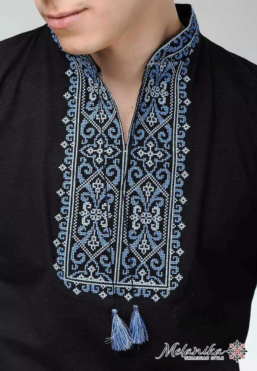 Зверніть увагу та дуже гарні та чіткі контури вишитого візерунку. Геометричний орнамент завжди найкраще відбивав справжню чоловічу природу. Блакитні нитки додають стилю цій моделі. Ви точно помітите магнетизм цієї вишитої футболки.
