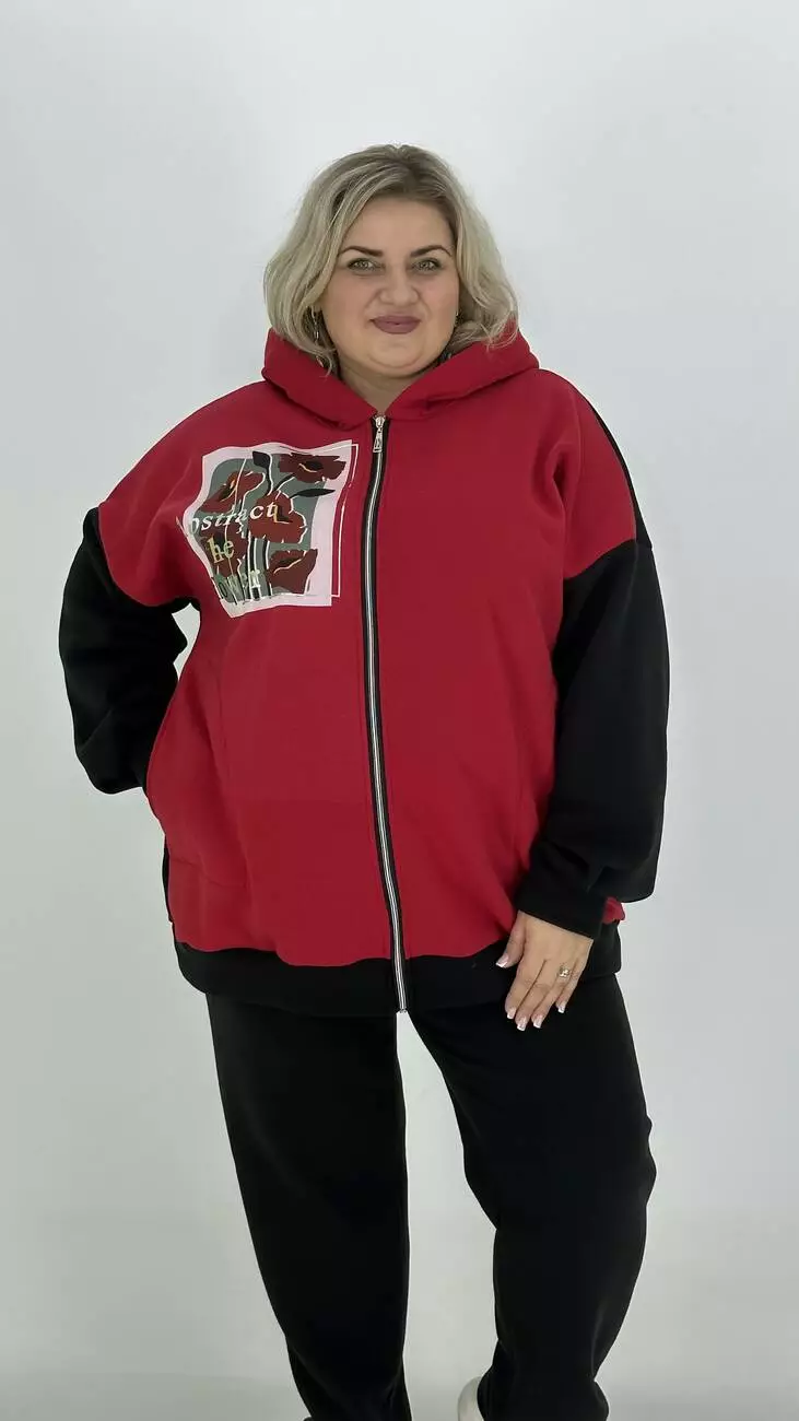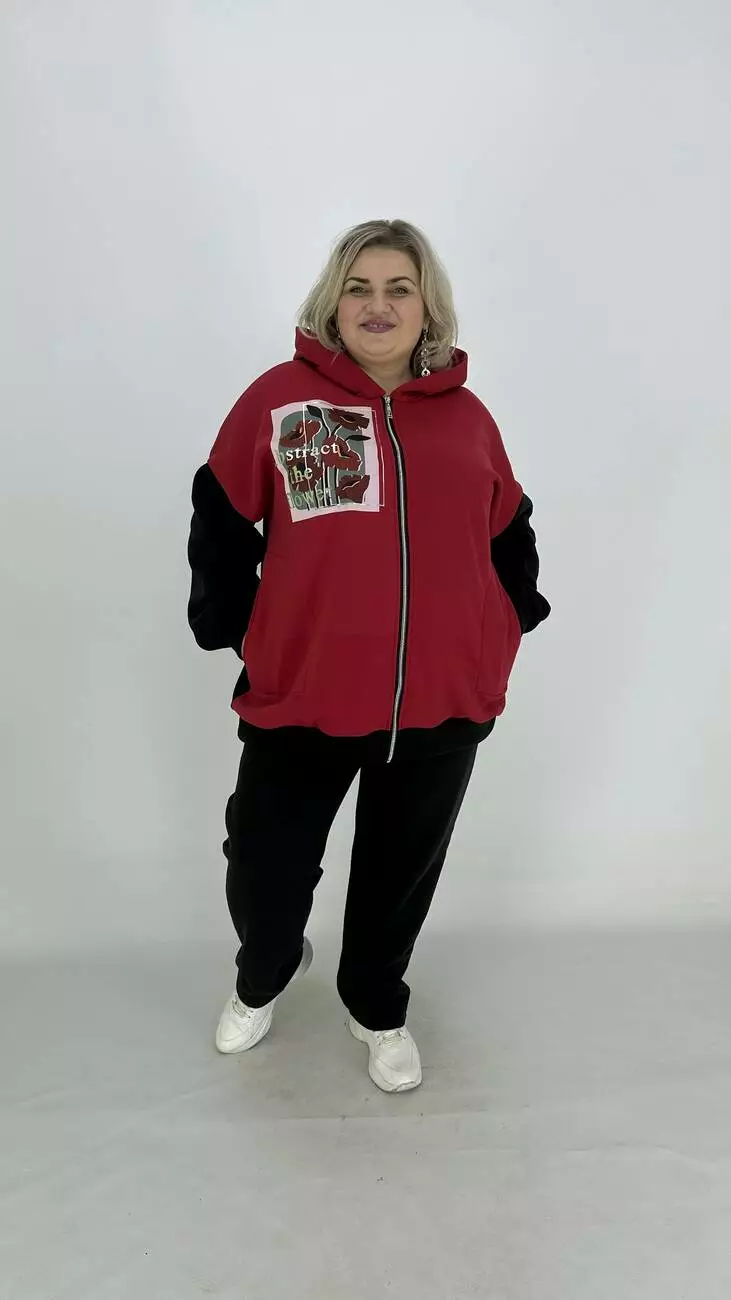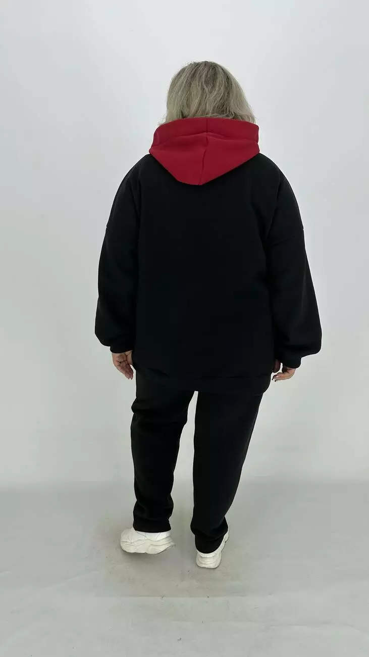 Фасон-оверсайз-спущене плече комбінована з двох кольорів, прикрашена тканинним накатом та фольгою. Основний колір — чорний. Для комплекту пропонуємо окремо штани 3х нитка.