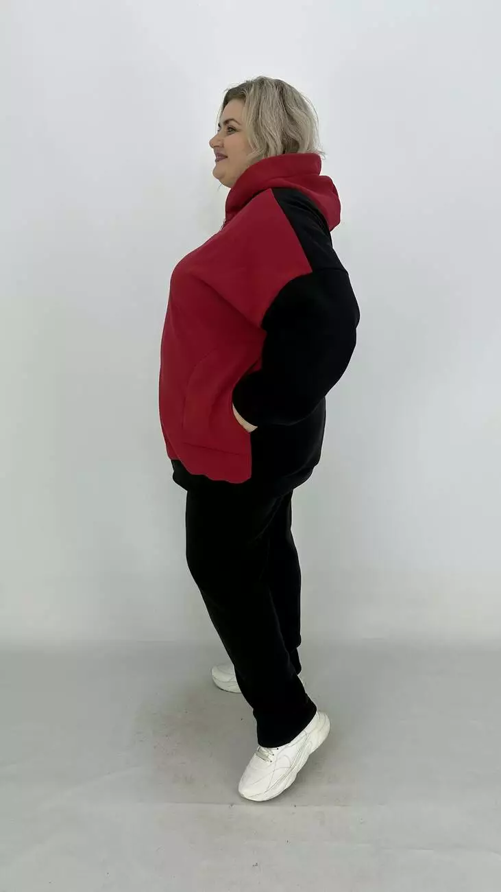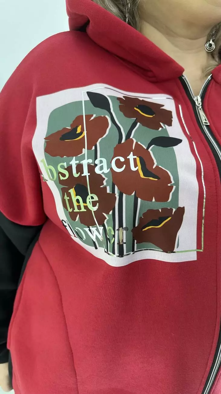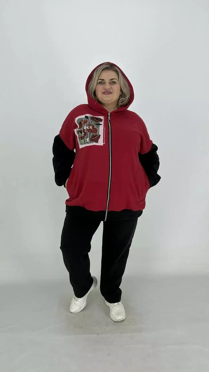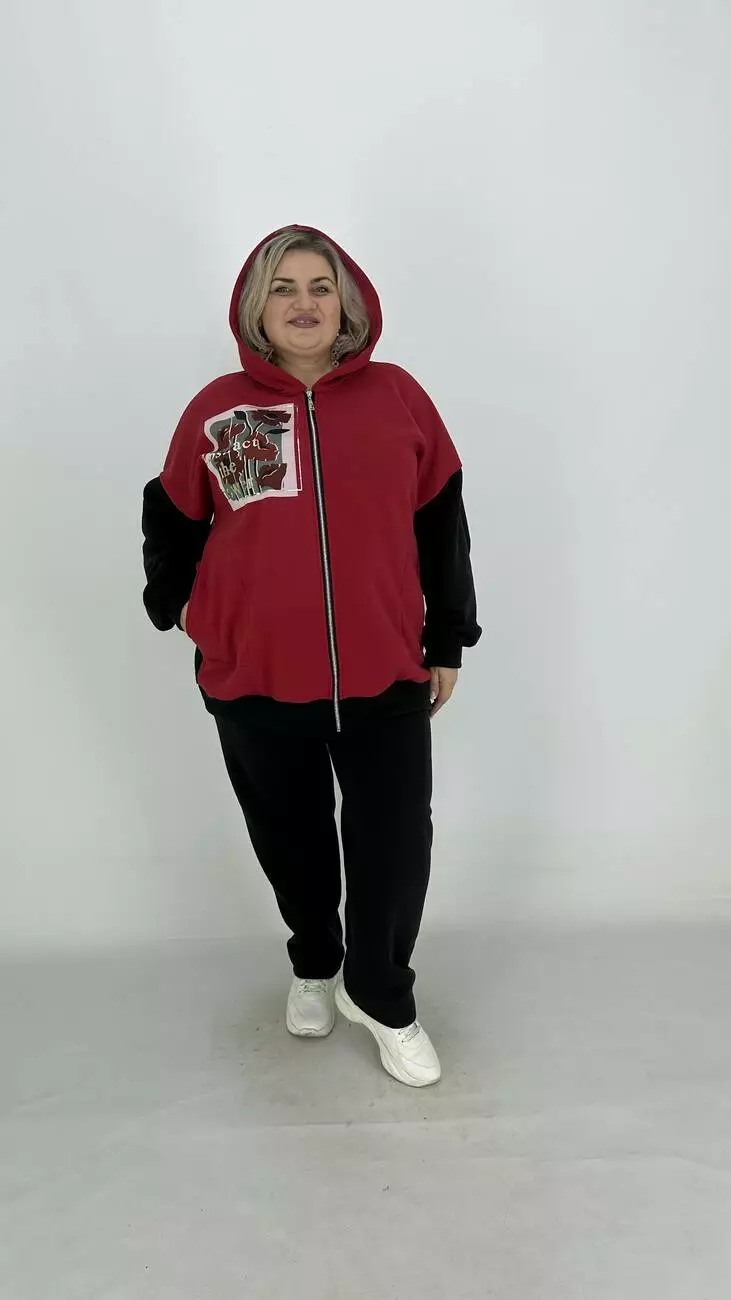Фасон-оверсайз-спущене плече комбінована з двох кольорів, прикрашена тканинним накатом та фольгою. Основний колір — чорний. Для комплекту пропонуємо окремо штани 3х нитка.