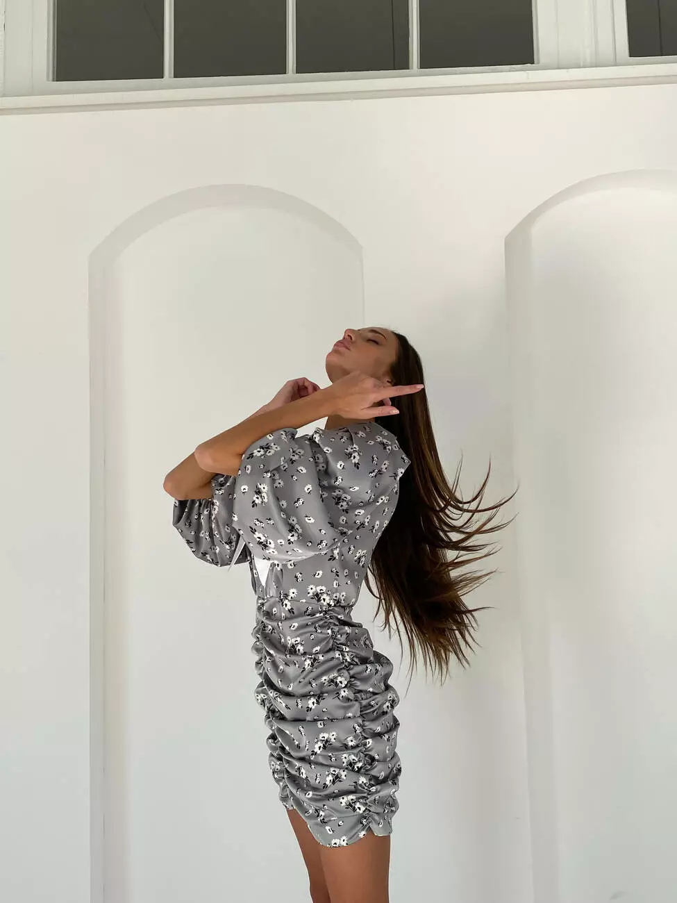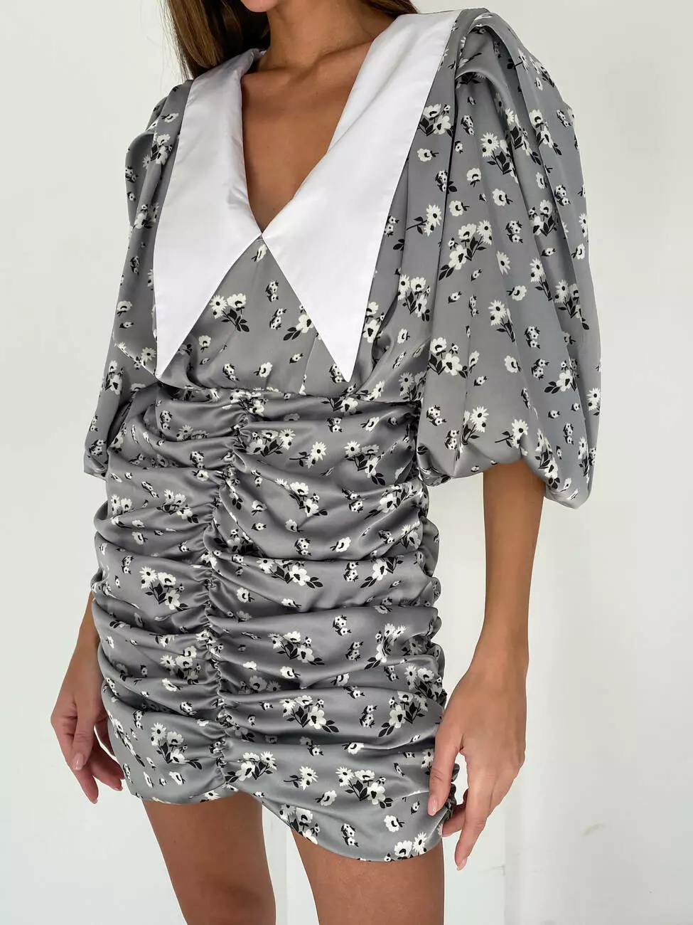 Стильна трендова шовкова міні сукня Kamilla з відкладним комірцем та V-подібним декольте графітового кольору квітковий принт