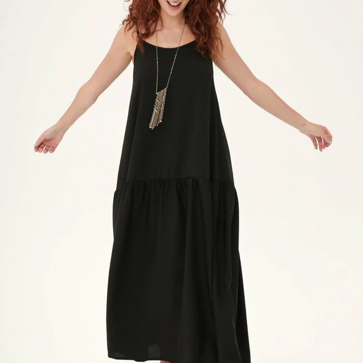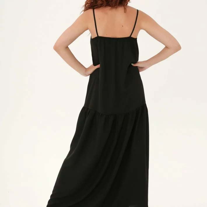 Довгий сарафан з бретелями виконаний з структурної тканини, позаду
