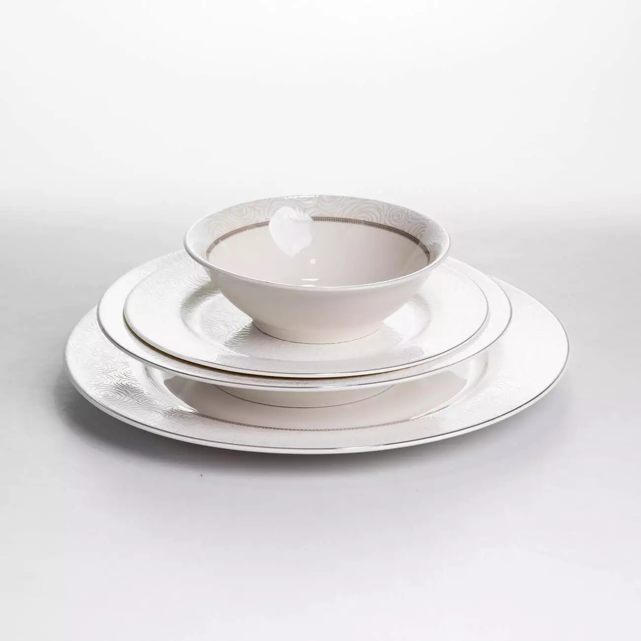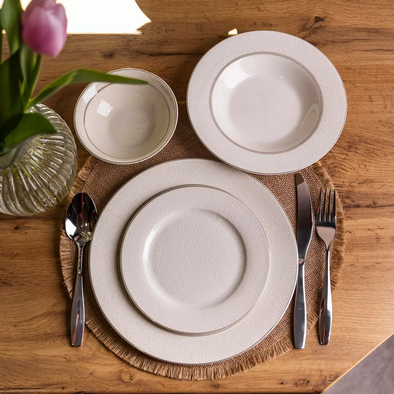Порцеляновий столовий сервіз Celestia на 24 предмети призначений для сервірування столу на 6 персон. До комплектації входять 6 обідніх, 6 десертних, 6 супових тарілок і 6 салатників, що дозволяє зручно організувати подачу основних страв, супів, салатів і десертів під час щоденного прийому їжі або святкового застілля. Така комплектація забезпечує повний набір посуду для впорядкованого сервірування столу.