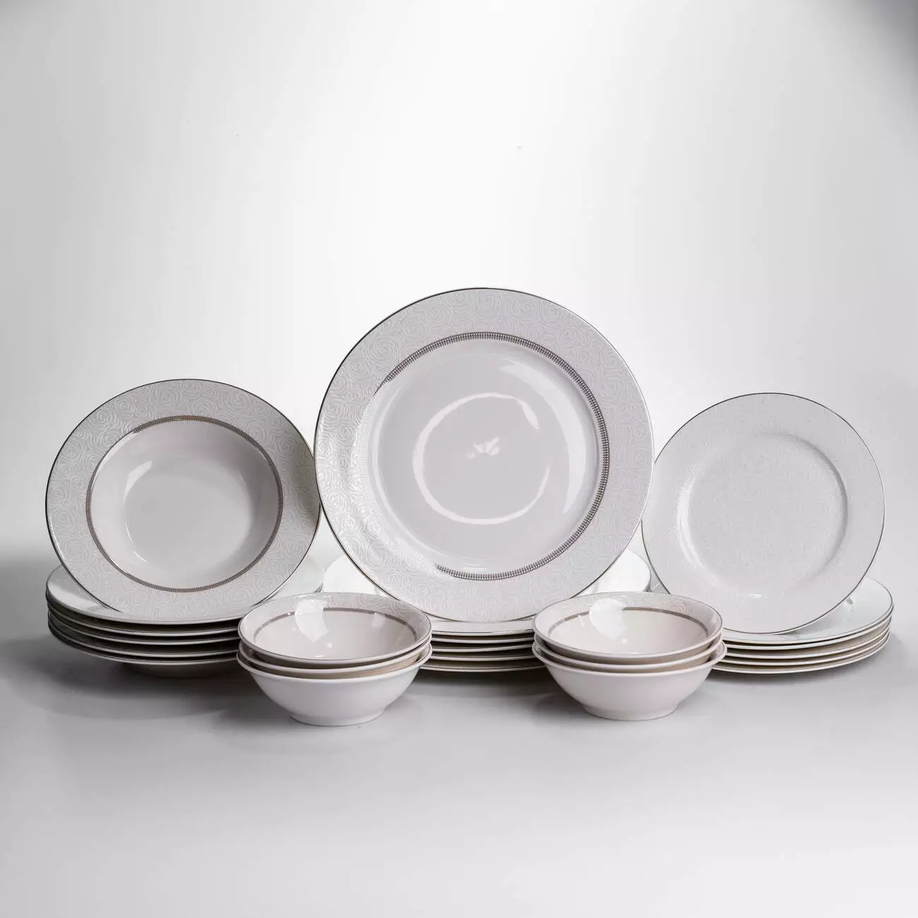 • Комплектація: 6 обідніх тарілок, 6 десертних тарілок, 6 супових тарілок, 6 салатників