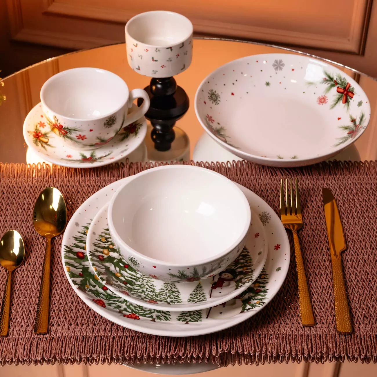 Порцеляновий столовий сервіз Christmas Tree на 6 персон — це набір, створений для святкової атмосфери та комфортних зимових вечорів. Кожен елемент оздоблений витонченими різдвяними мотивами: ялинками, сніжинками та декоративними гілками. Декор виконано методом термопереносу, що гарантує довговічність малюнка навіть після багаторазового миття. Витриманий у традиційних святкових кольорах, сервіз додає тепла й настрою будь-якому застіллю.