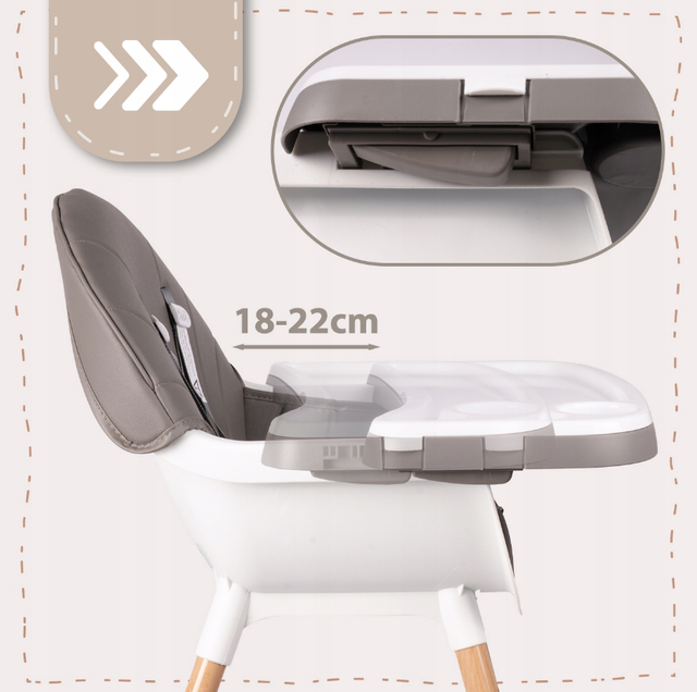 Регулируемое расстояние между подносом и спинкой (от 18 см до 22 см) позволяет идеально адаптировать пространство к потребностям растущего ребенка. Это обеспечивает малышу больший комфорт во время его первых попыток самостоятельного приема пищи, а вы можете легко отрегулировать положение столешницы в соответствии с возрастом и осанкой ребенка. Кроме того, съемная крышка позволяет быстро и без хлопот убирать за собой посуду после еды.