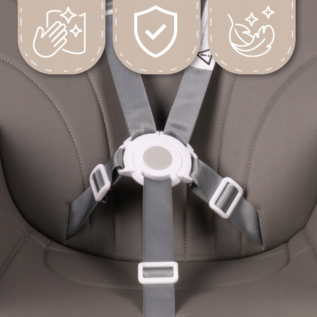 Стульчик оснащен 5-точечными ремнями безопасности с клином между ножками, чтобы предотвратить случайное выскальзывание ребенка.