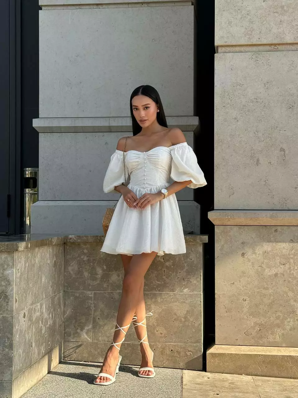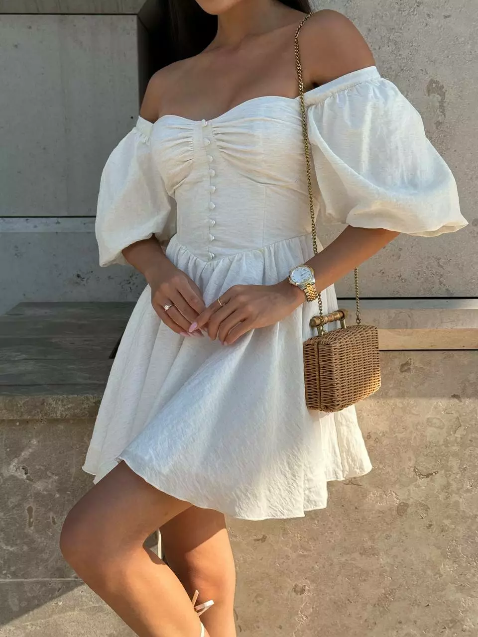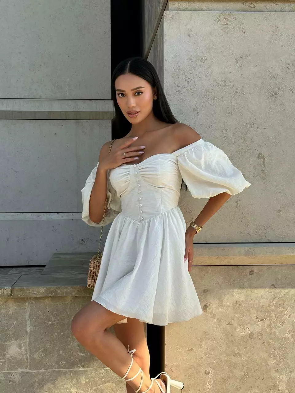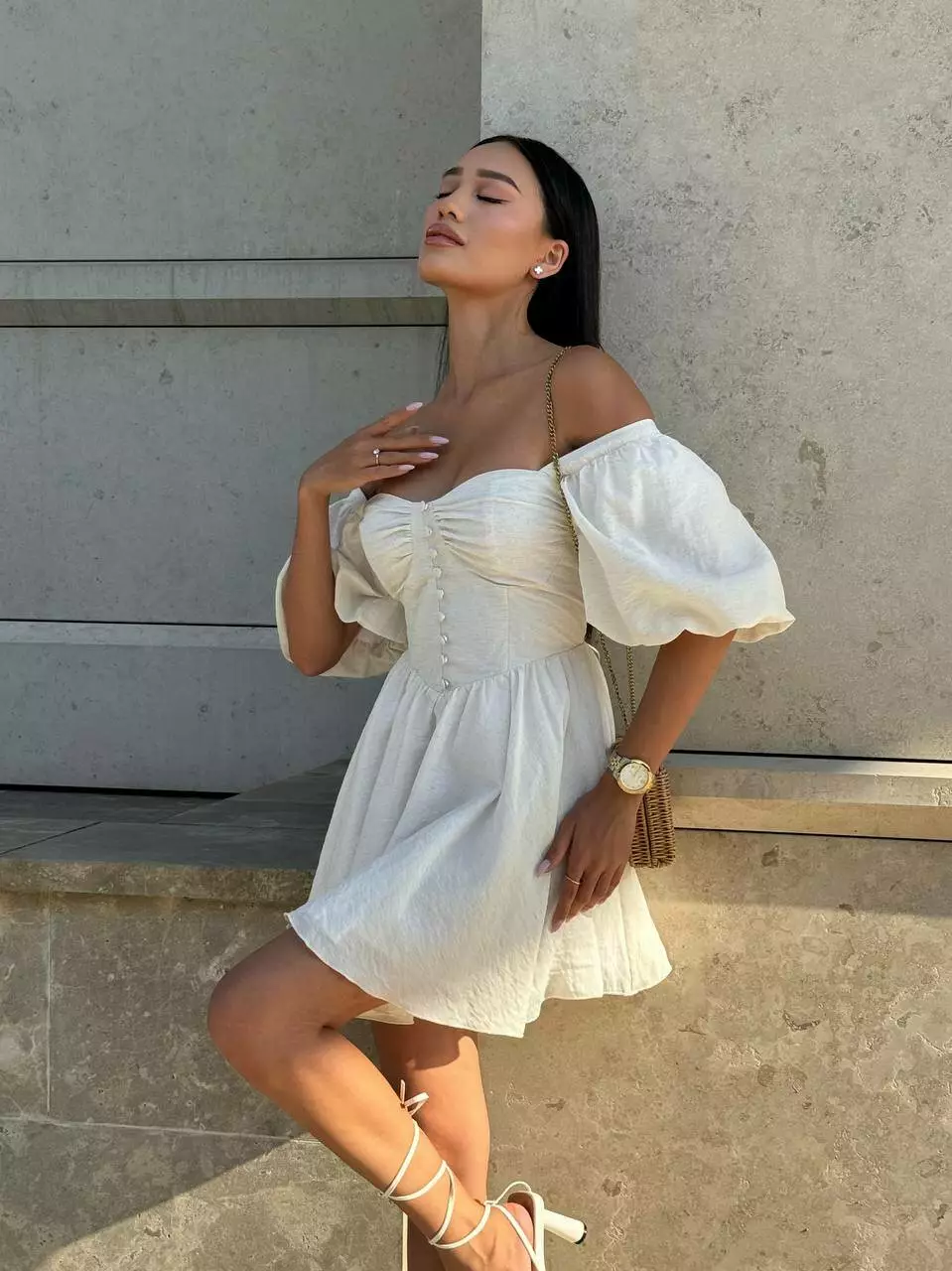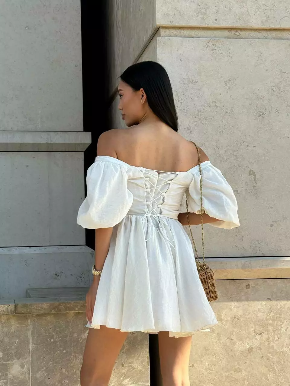 Тендітна корсетна сукня з мʼяким ліфом, обʼємними рукавами та пишною спідницею. Обʼєм сукні регулюється корсетною шнурівкою по спинці.