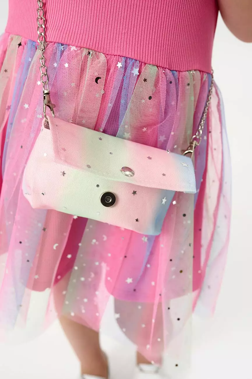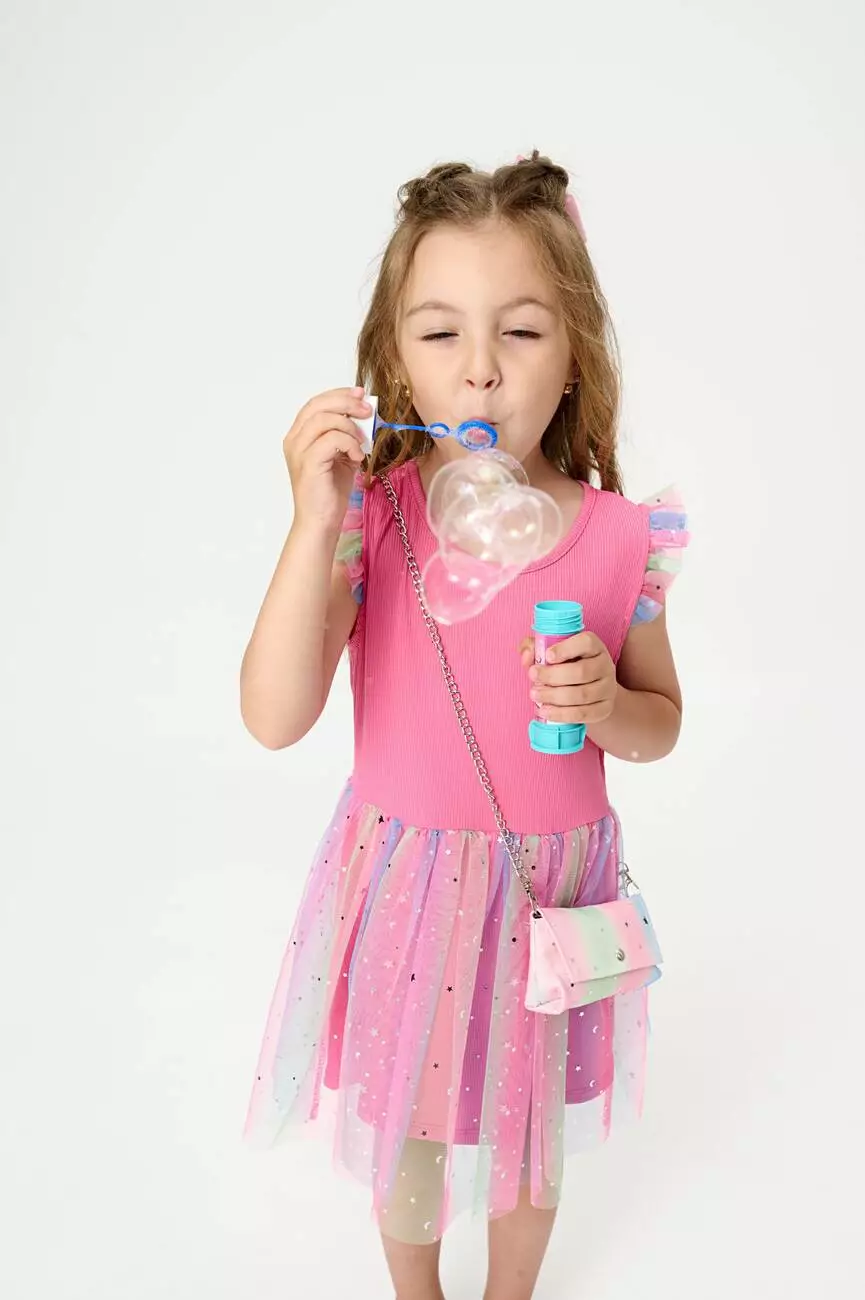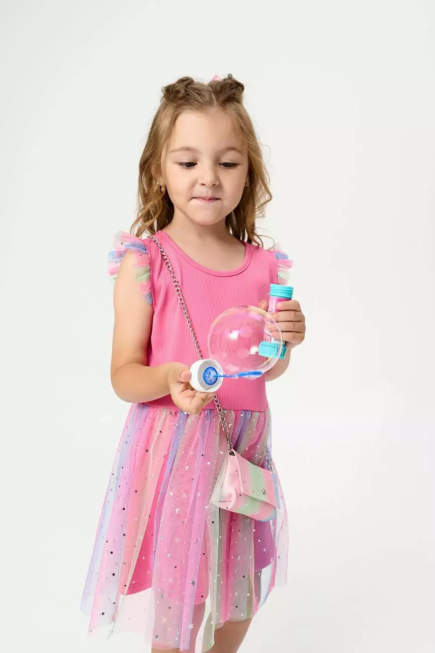 Сумочка на ланцюжку у подарунок! Деталі моделі: основний колір сукні – малиновий. Кругла горловина. Короткий рукав-крильце, виконаний з фатину. Спідниця виконана з фатину, у забарвленні веселки. Сукня без застібок. Кишень немає. Довжина виробу – по коліно. Матеріал – бавовна. Розмірний ряд: на зріст від 92см до 146см.