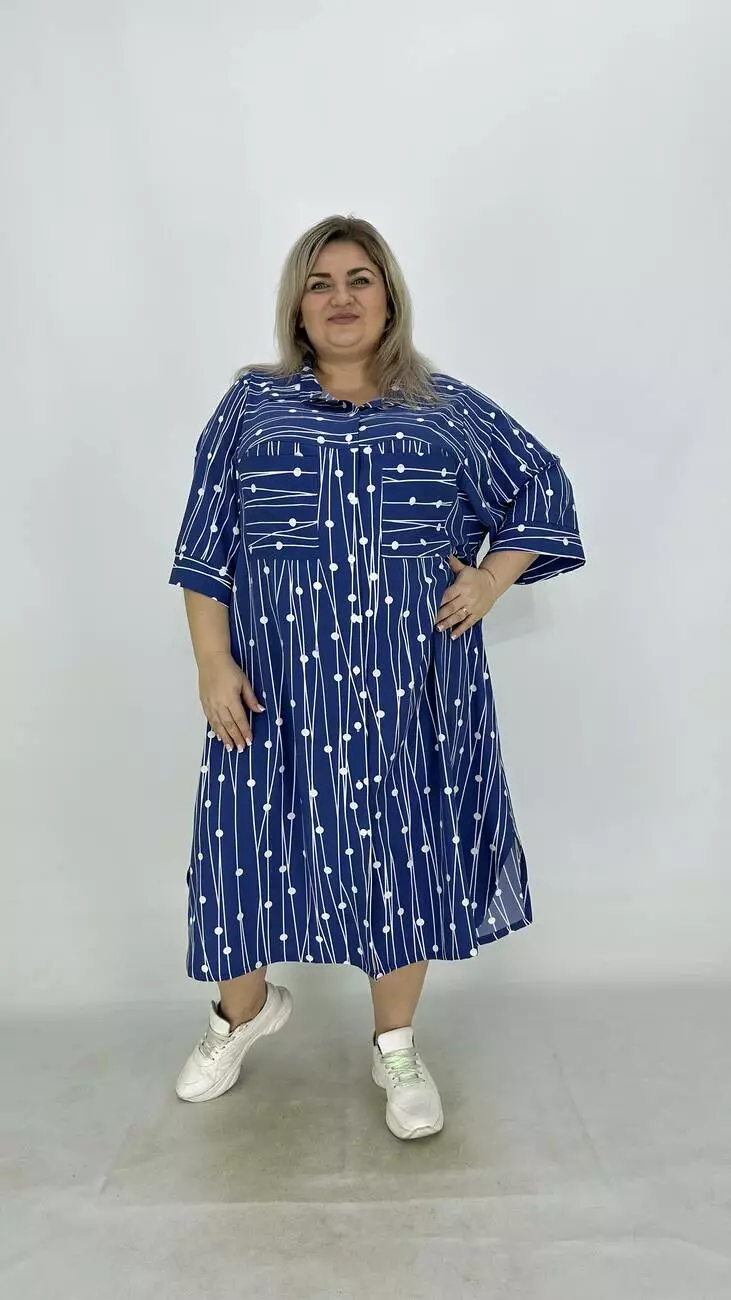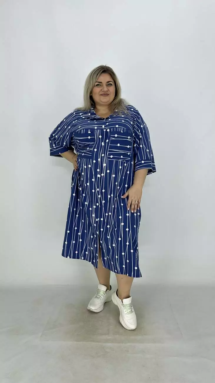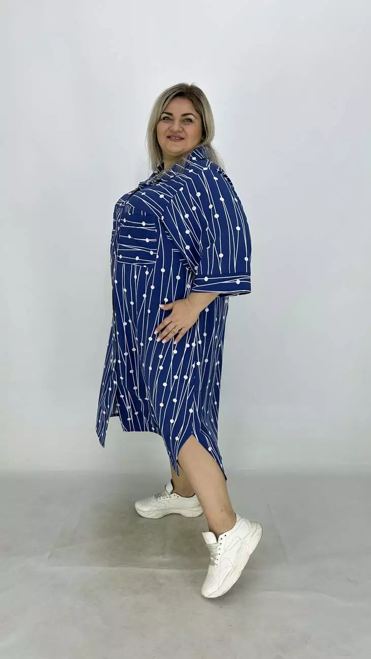 Сукня - сорочка з супер софту, дуже легка, м'яка, приємна до тіла, не меніться, розтяжності немає. Силует трапеція, по грудях вільне, опущена пройма підходить на будь-які груди, з боків підрізи. Комір сорочковий, кишені накладні, застібається на гудзики.