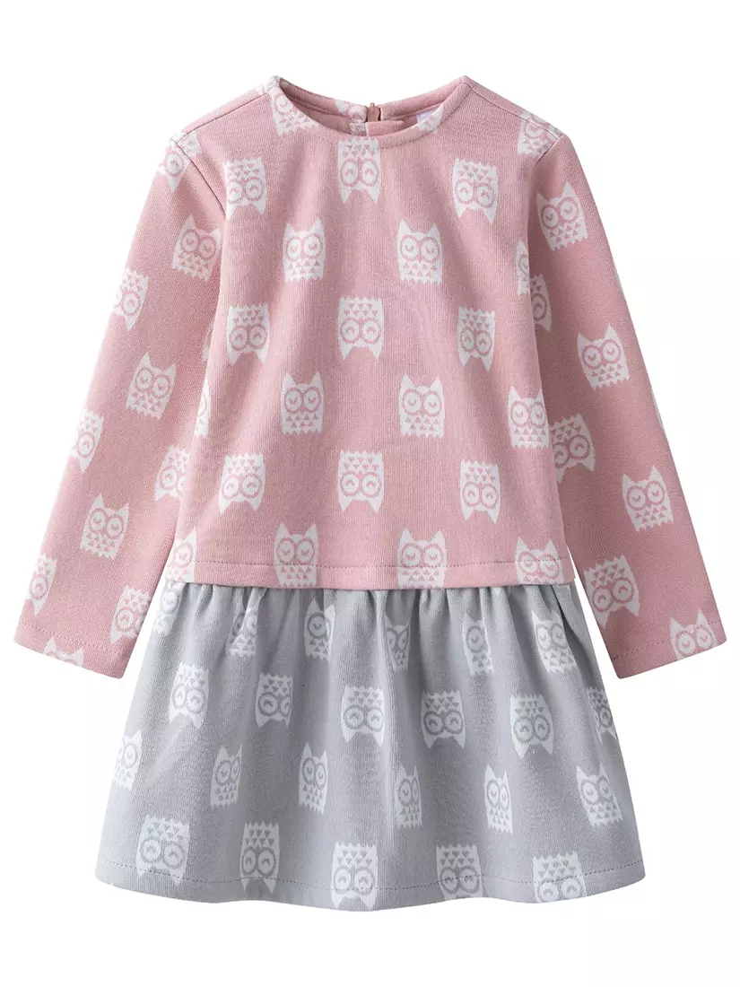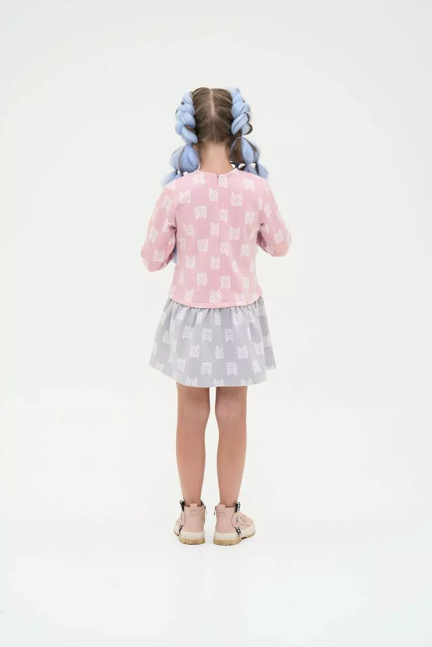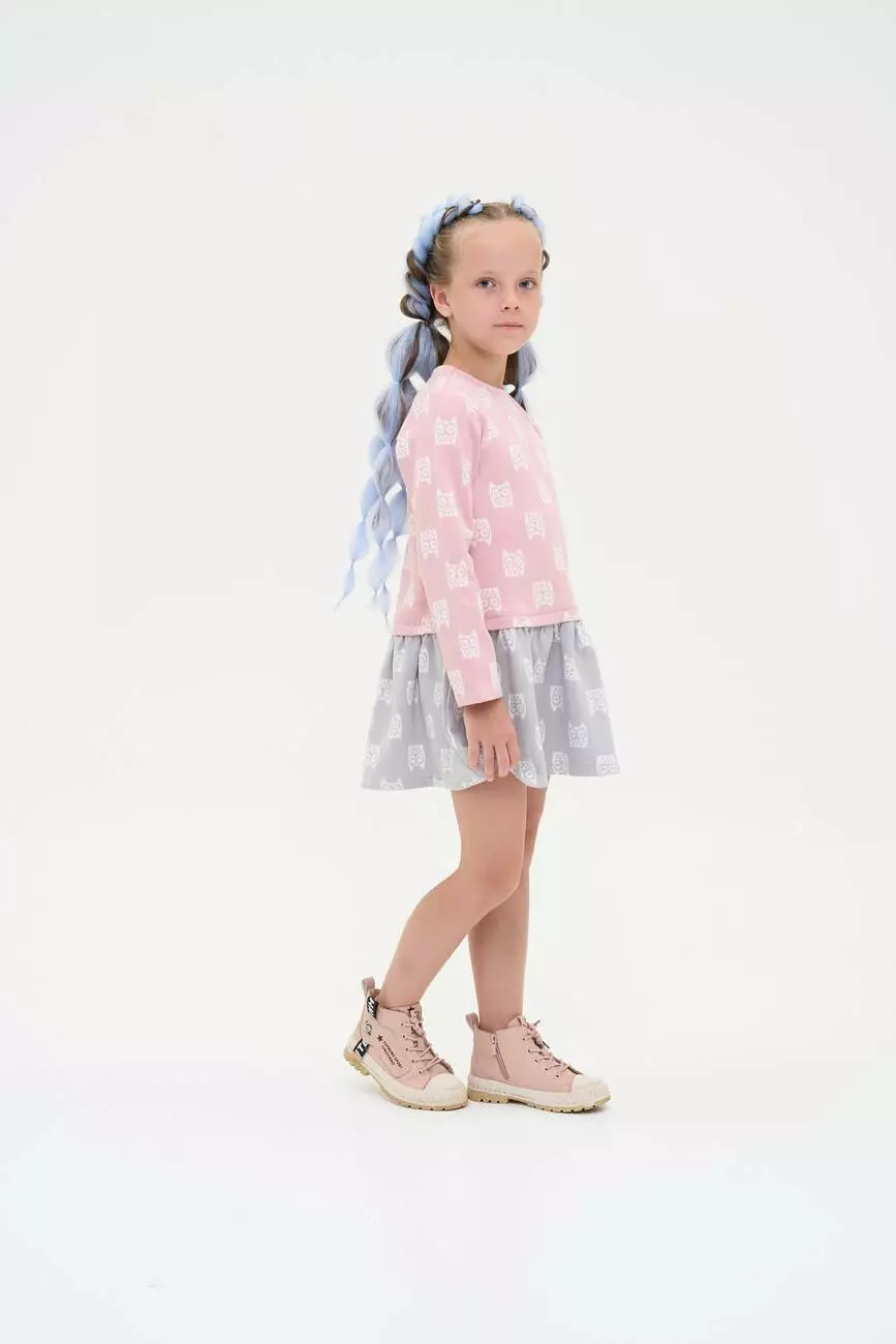 Зустрічайте нову колекцію - колаборація брендів YUMSTER і NEWNESS! Контраст рожевого із сірим створює візуальний інтерес та робить цю модель по-справжньому привабливою. Деталі моделі: сукня виконана в контрастних відтінках рожевого та сірого. Кругла горловина, довгий рукав. Застібка – на спинці блискавка. Верх сукні прямого крою, спідниця злегка розпушена. Занижена лінія талії. По всій сукні наймиліший принт - совушки. Розмірний ряд: на зріст від 98 см до 140 см