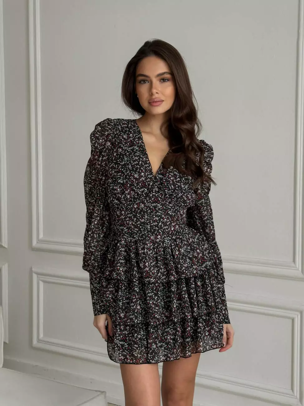 Тендітна повітряна сукня, з V -образним декольте. Талія має ефект утяжки талії, по спинці резинка. Широкі манжети рукавів декоровані ґудзиками обтягнутими в тканину. Спідниця 3 шарова та пишна.