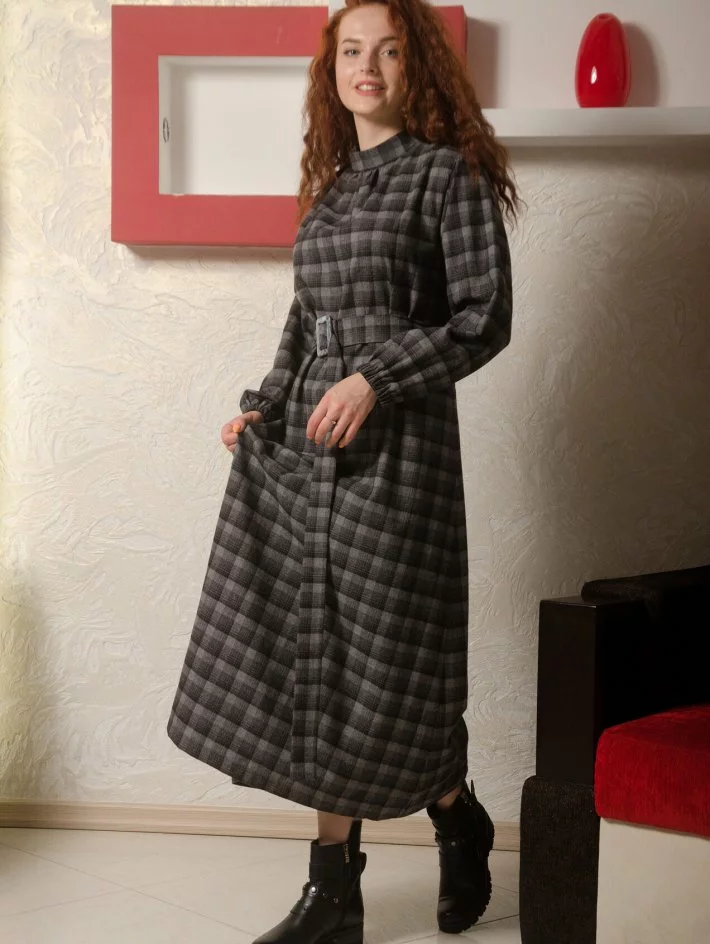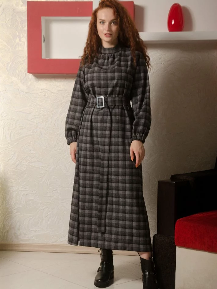 Сукня з тканини у клітку трапецеподібного крою. Рукав вільний на