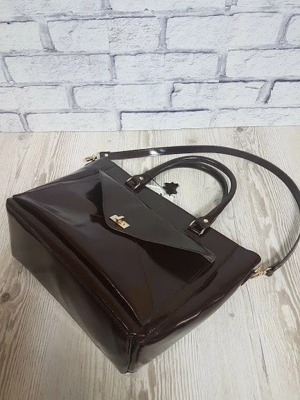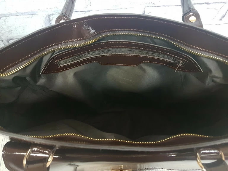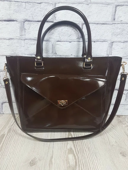 Сумка на подкладке, внутри находятся два открытых кармана (по надобности можем сделать дополнительный карман на молнии). Присутствуют плечевой ремень и короткие ручки, которые по надобности мы можем удлинить или укоротить. Плечевой ремень двойной, не регулируется. Снаружи находится конверт-карман на поворотном замке.