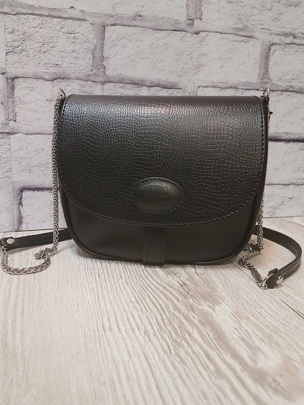 Сумка женская "Римини" натуральная кожа, черная клапан под рептилию с цепочкой на ремне