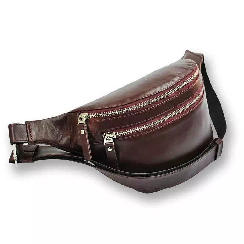 Шкіряна жіноча сумка на пояс пошита з натуральної шкіри наппа бордового кольору .