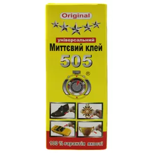 Для быстрого соединения небольших деталей используется супер-клей 505. При нанесении на поверхность клей мгновенно полимеризуется, что обеспечивает надежность соединения различных материалов. Благодаря прозрачной консистенции и специальному составу клея образуется прочный шов. Соединению характерна высокая прочность, устойчивость к различным погодным условиям. Соединить поверхности, выполненные из любых материалов, под силу клеящему веществу. Кожа, картон, пластмасса, пластик, дерево, металл, фарфор и множество других материалов могут быть склеены посредством клея 505.