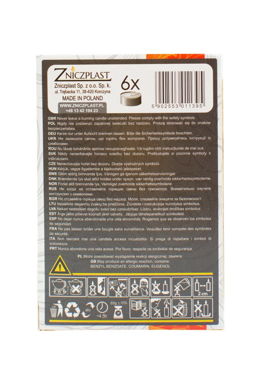 Це чайні свічки стандартного розміру діаметром 3,5 см і лише 1,5 см заввишки, вони горять близько чотирьох годин, пропонуючи не лише справжнє м’яке світло свічок, але й неймовірний аромат для вашого дому.