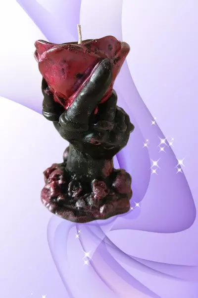 Ця загадкова та потужна ритуальна свічка у формі руки, що стискає троянду, прикрашена невеликими черепами, що надає їй глибокий символізм. Чорний колір уособлює трансформацію, захист і приховані знання, троянда символізує любов, таємні бажання та внутрішню силу, а черепа нагадують про мудрість предків і неминучість змін.