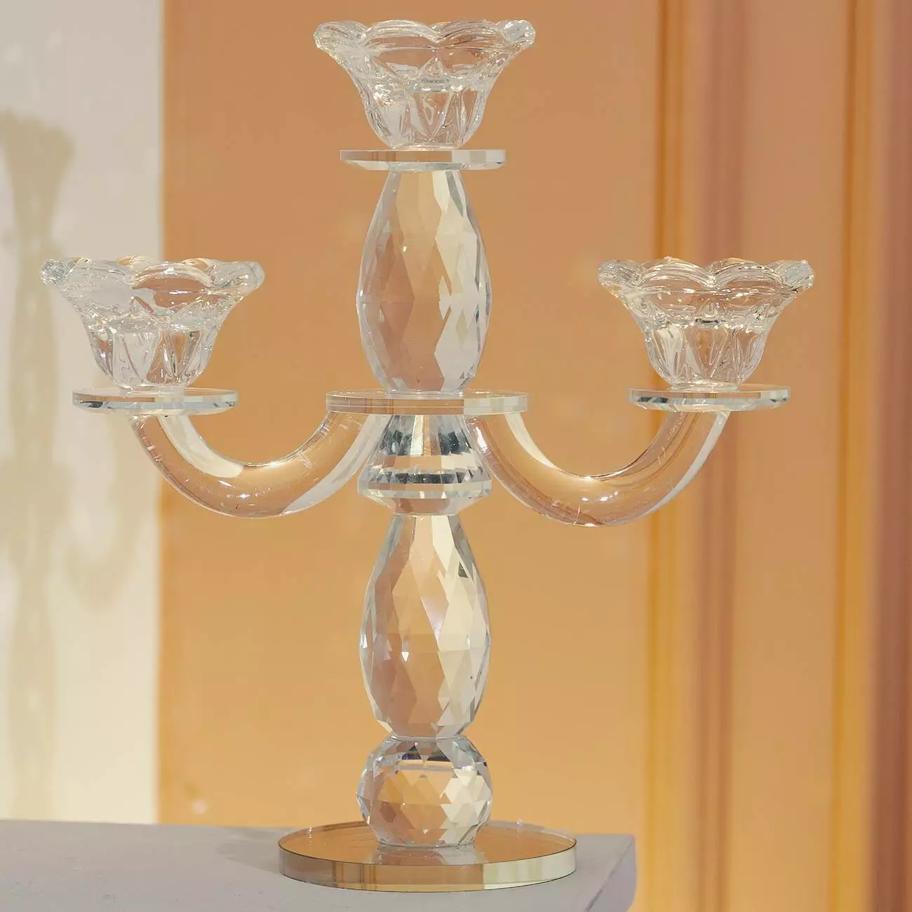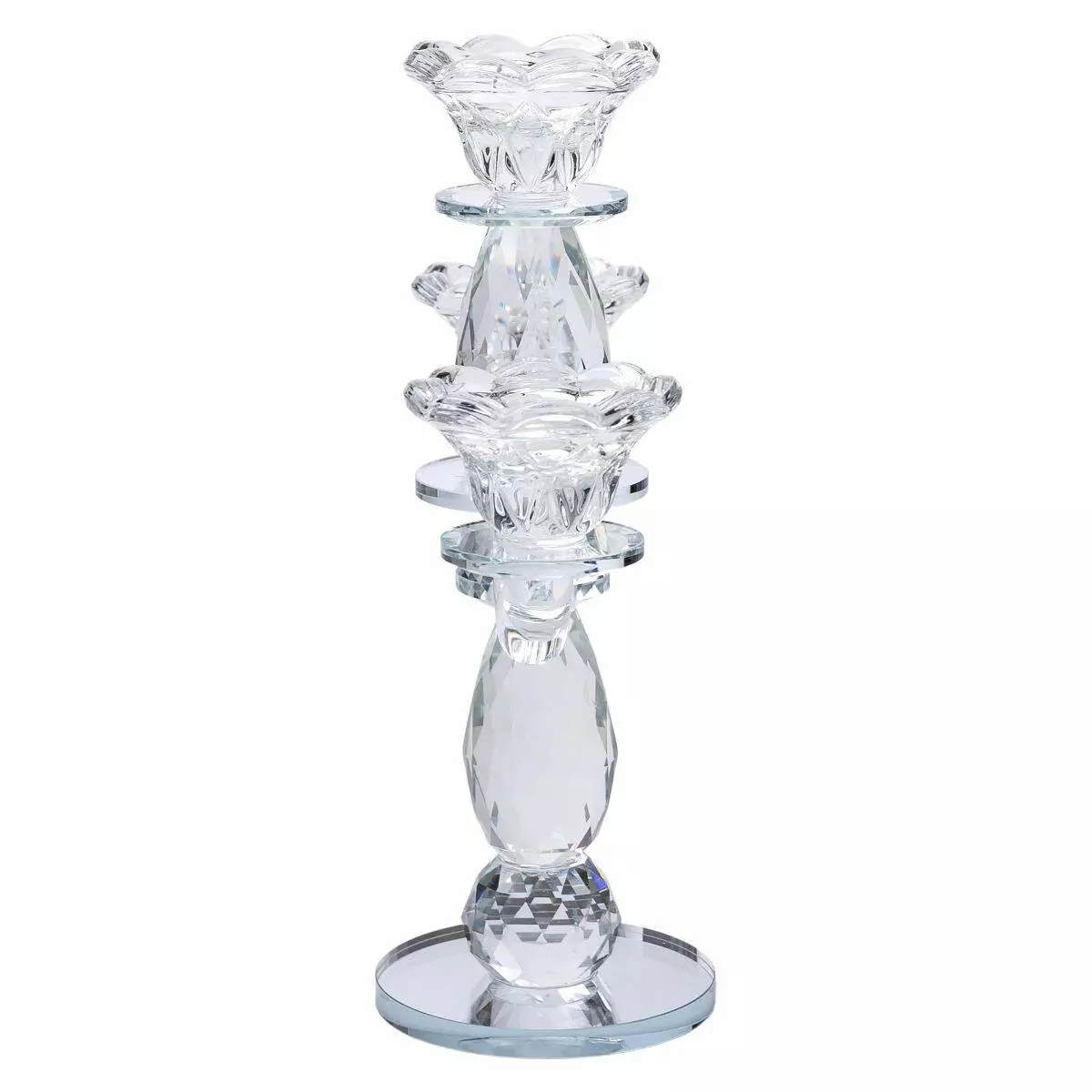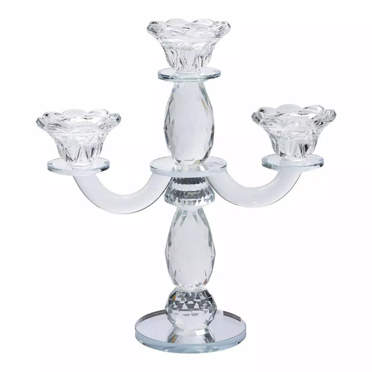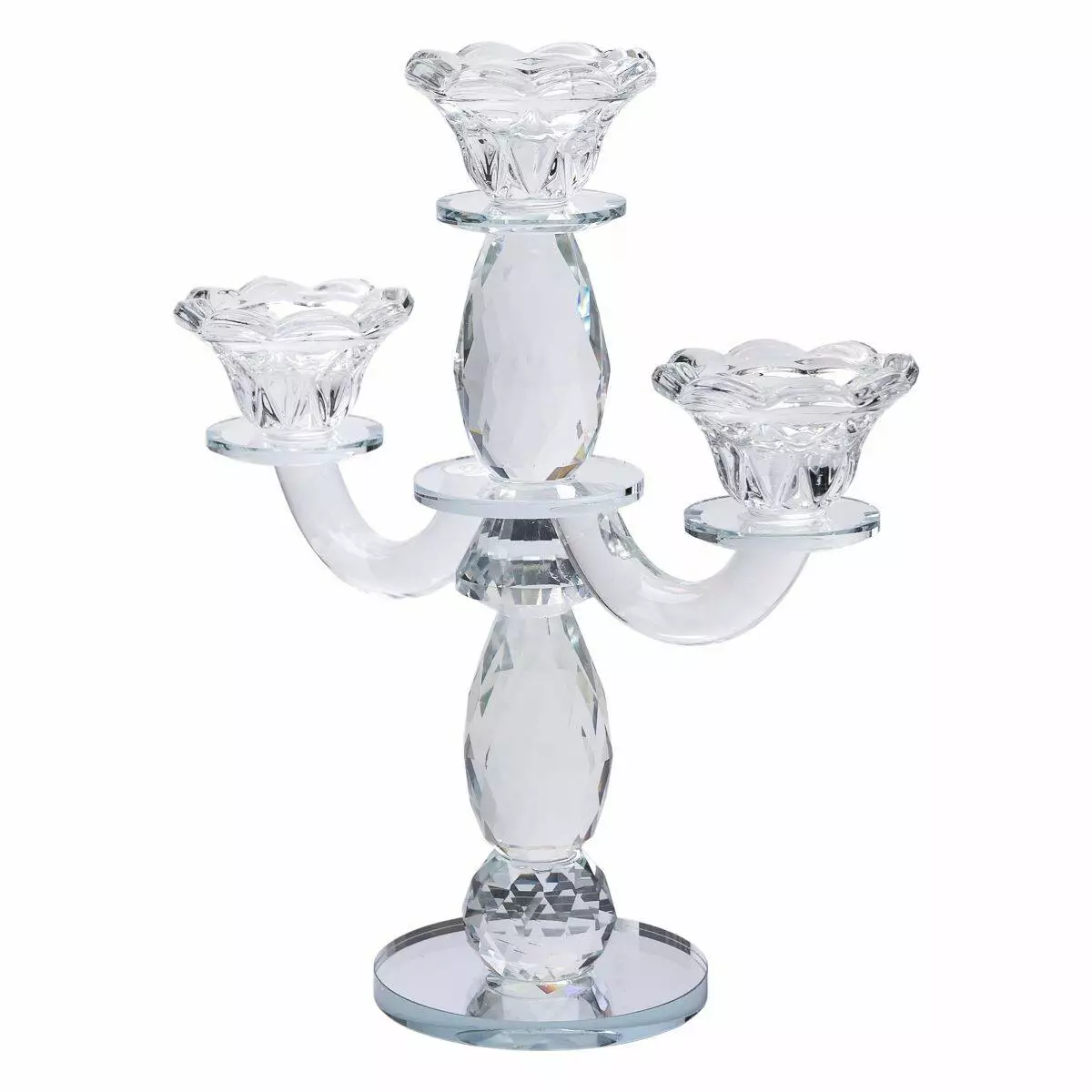Свічник виготовлений зі скла, завдяки чому світло свічок заломлюється в гранях, створюючи дивовижну гру відблисків. Чаші для свічок у формі кольорів доповнюють композицію, надаючи свічнику вишуканий вигляд.