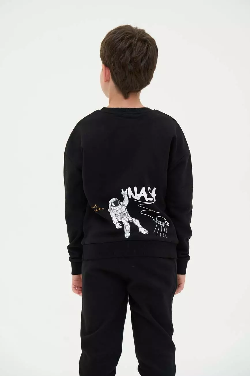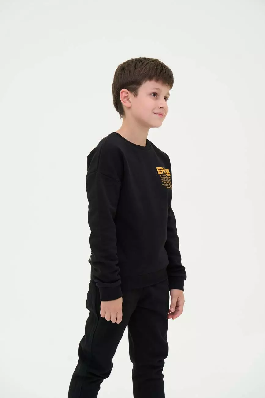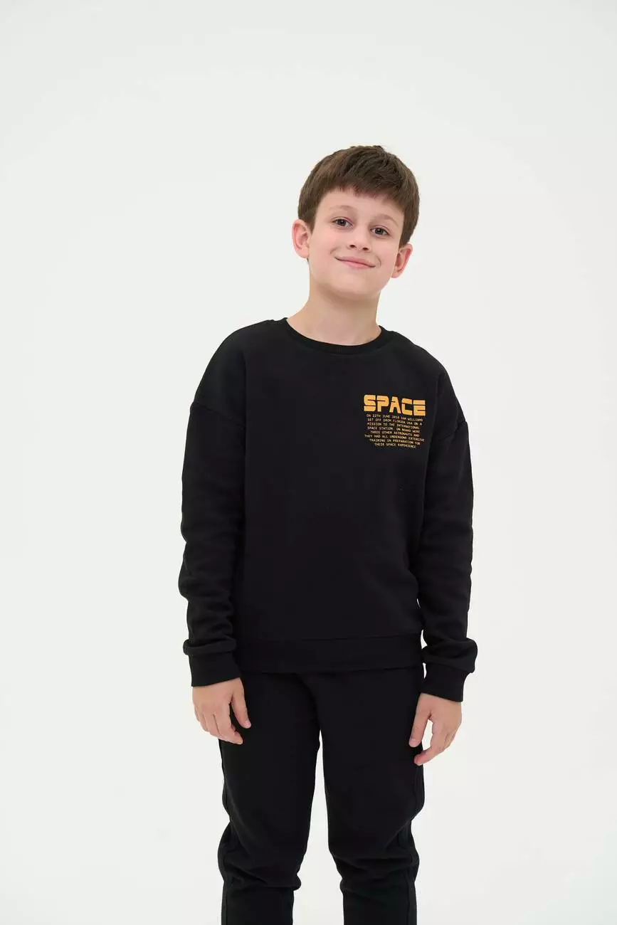 Зустрічайте нову колекцію - колаборація брендів YUMSTER і NEWNESS! Деталі моделі: світшот чорного кольору. Кругла горловина, довгий рукав. Попереду помаранчевий принт у вигляді тексту. На спині принт білого кольору у вигляді графічного малюнка. Горловина, манжети на рукавах та низ світшота обрамлені еластичною резинкою. Розмірний ряд: на зріст від 128 см до 164 см