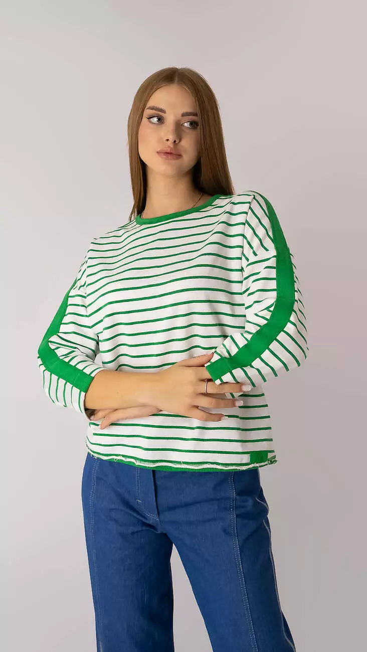 Світшот вільного крою, з оригінальним оздобленням на рукавах, відкритими зрізами.