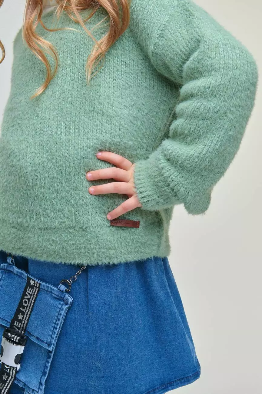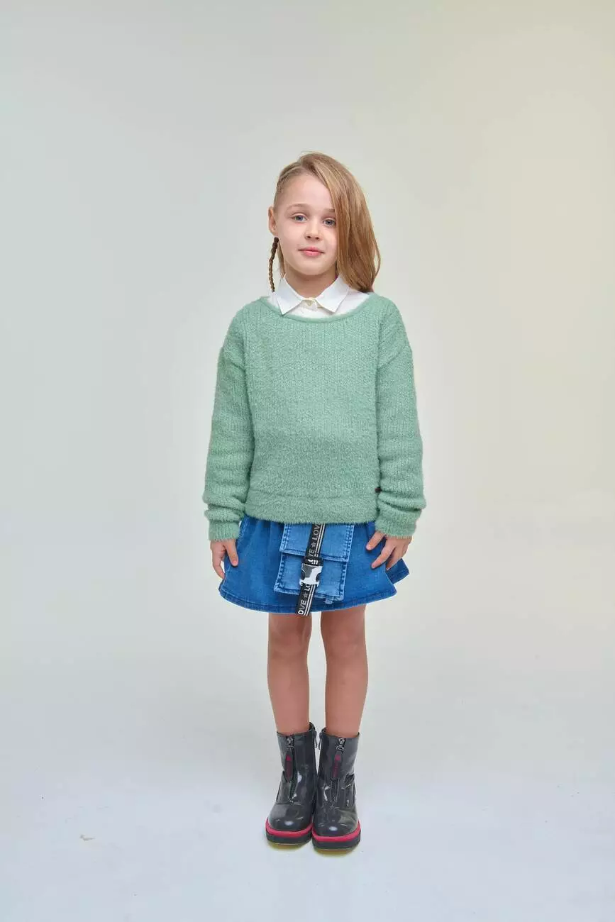 Деталі: Світшот м'ятного кольору. Кругла горловина, довгий рукав. На рукавах та по низу світшота манжети з основної тканини. Занижена лінія плеча. Фасон: прямий. Дуже м'яка та ніжна пряжа. Розмірний ряд: на зріст від 104 см до 164 см.