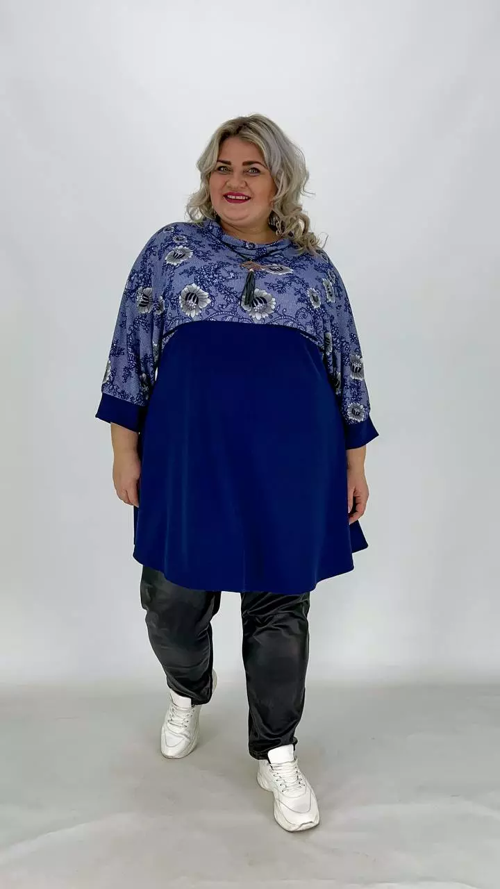 Вільна туніка із трикотажу А-подібний силует, рукав кімоно, кишені накладні. Тканина двонитка комбінована з рубчиком, м'яка, приємна до тіла, не меніться.