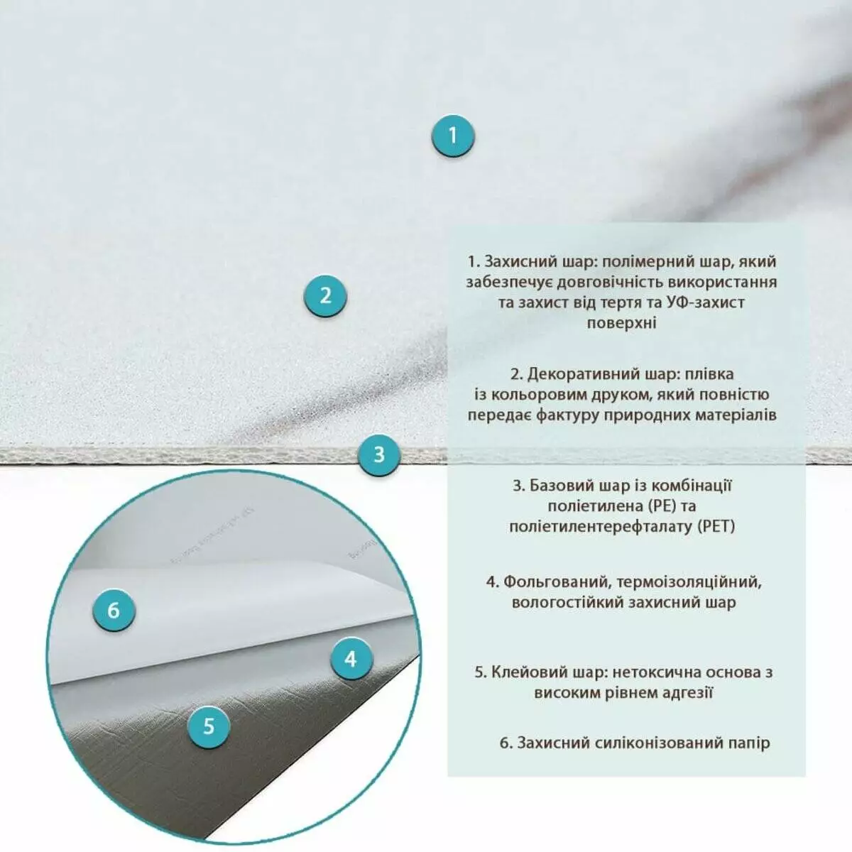2. Декоративний шар: плівка з кольоровим друком високої якості, яка повністю імітує фактуру природних матеріалів завдяки чіткому та деталізованому зображенню.