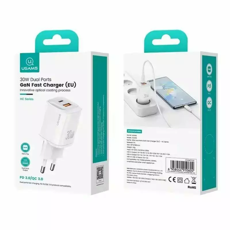 СЗУ Usams CC254 30W A+C Dual Ports GaN Fast Charger - HC Series Белый